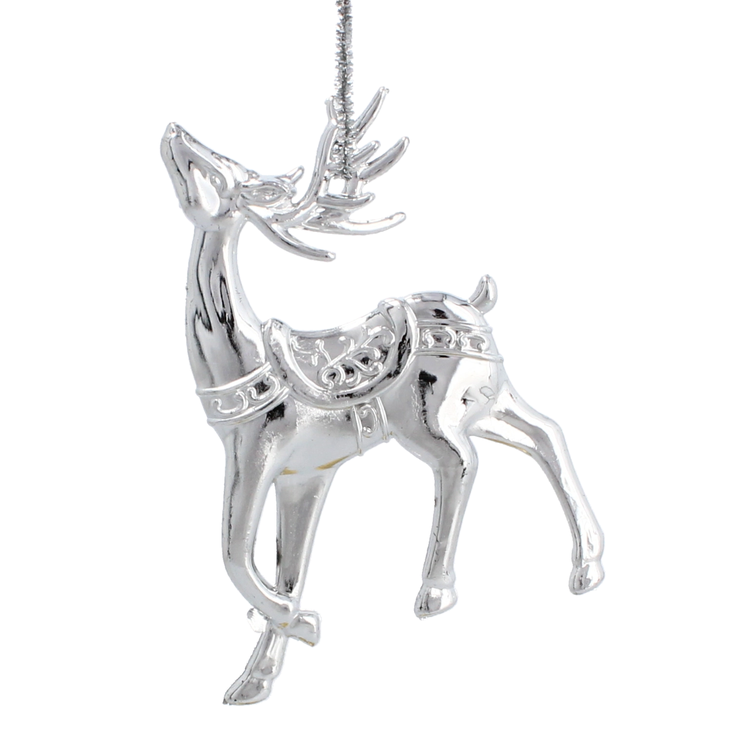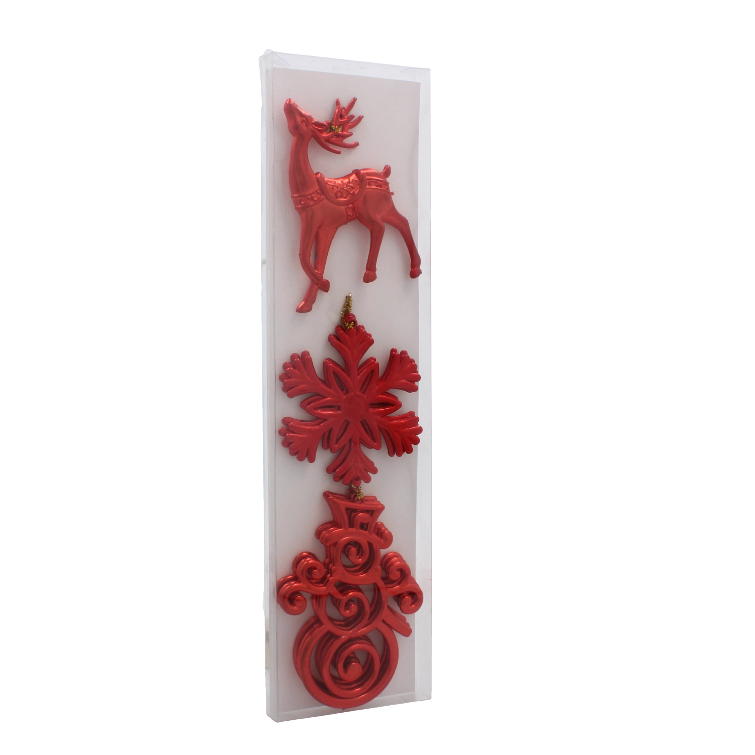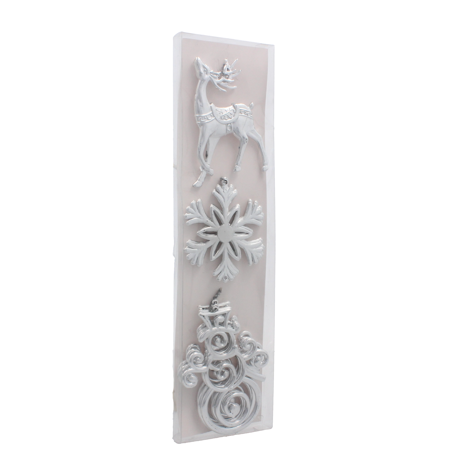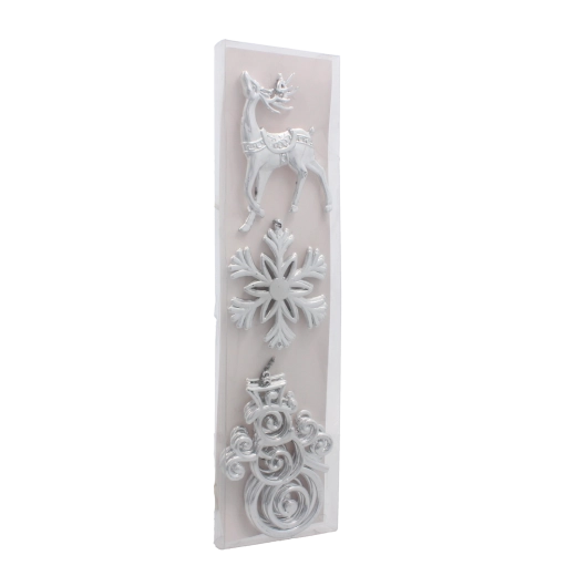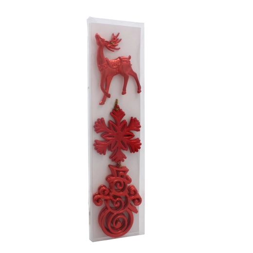 Elegáns, három darabból álló karácsonyi díszszett rénszarvas, hópehely és hóember formában, amely ragyogást kölcsönöz a karácsonyfának és a belső térnek egyaránt. A könnyű anyag és a fényes felület szépen veri vissza a fényt, míg a praktikus akasztó hurok zsinórral könnyű felakasztást biztosít. Remek választás a hagyományos karácsonyi dekorációhoz elegáns színkeverékben.