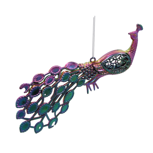Elegáns karácsonyi dísz páva formában, amely díszítésének egyedülálló csillogást és kifinomult megjelenést kölcsönöz. A szivárványos hatású, benzincsillogásra emlékeztető speciális felület a fény beesési szögétől függően változik, elbűvölő színátmeneteket hozva létre. A könnyű és tartós műanyag anyag és a praktikus csipesz megkönnyíti a rögzítést a fa ágain, girlandokon, koszorúkon és asztali dekorációkon is.