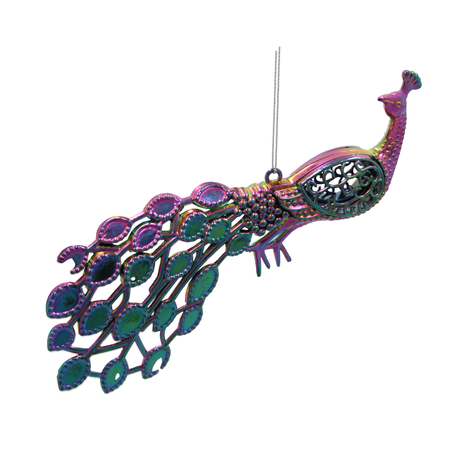 Ez a stílusos, páva alakú dísz figyelemfelkeltő eleme lesz karácsonyi dekorációjának. A benzincsillogás finom visszfényére emlékeztető, szivárványos felület irizáló hatást biztosít, amely különböző szögekből látható. Ennek köszönhetően a dísz luxushatást kelt, és bárhol is helyezi el, magára vonja a tekintetet.
