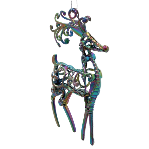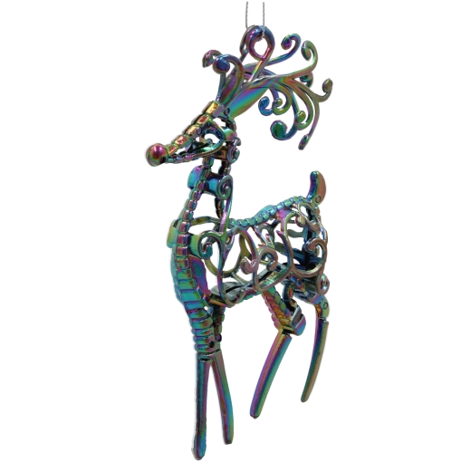 Vigyen egy kis rafinériát karácsonyi dekorációjába a szivárványosan irizáló, olajfény-hatású rénszarvas dísz segítségével. A speciális felület fény hatására változó, színjátszó csillogást kelt, amely kiemeli a fa és az ünnepi díszítések szépségét.