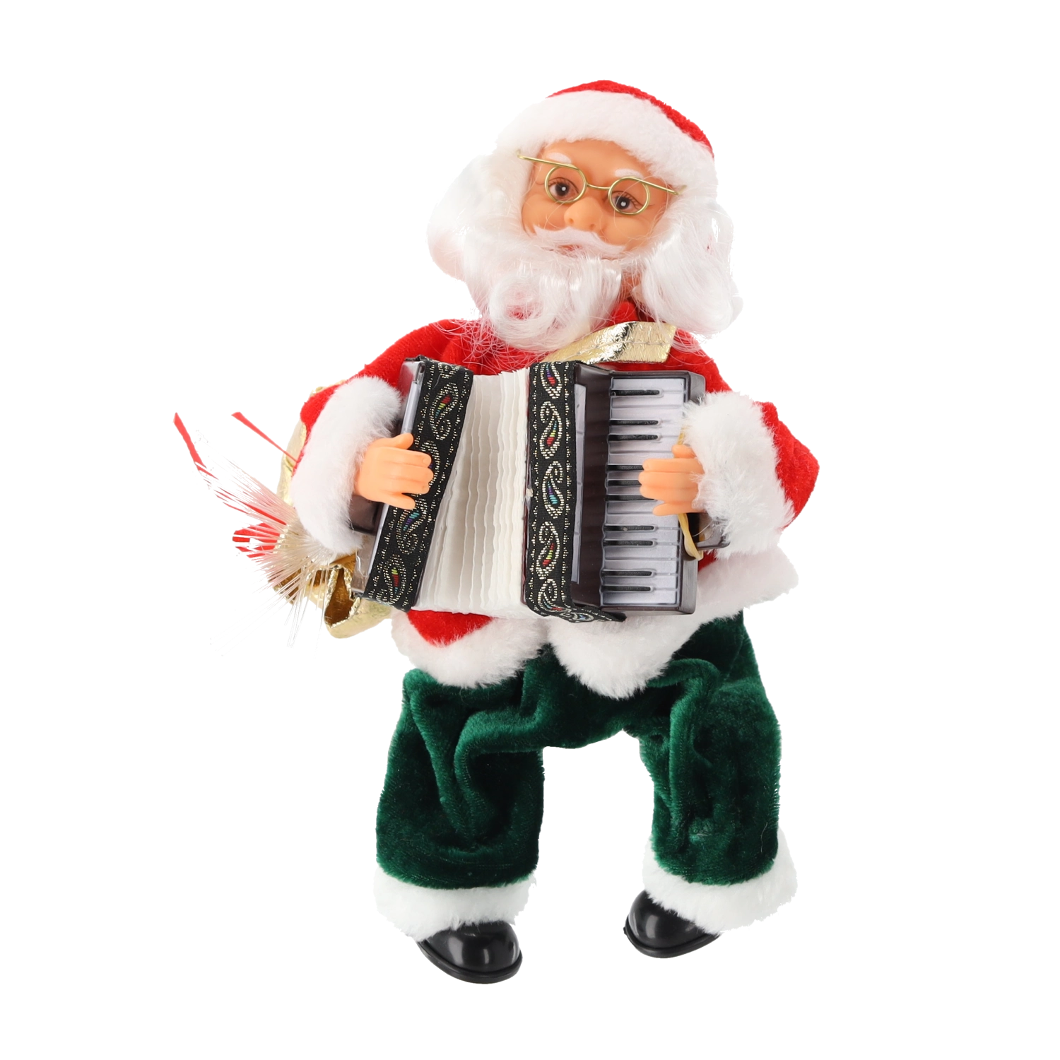 A Mikulás vidám dallamokat játszik, és szinkronban mozgatja a karjait és a harmonikát a maximálisan életteli hatásért.