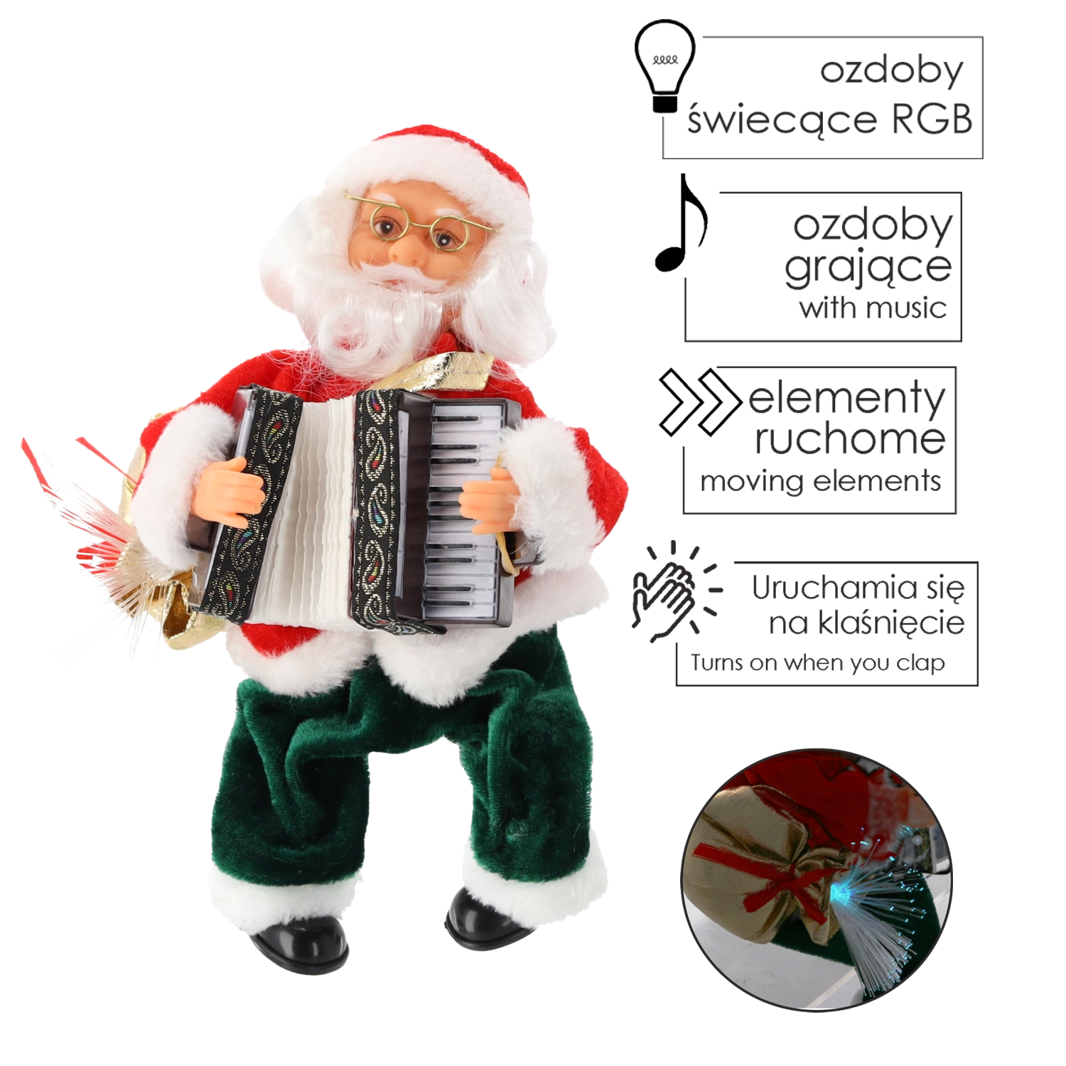 Varázsold otthonodba a karácsony hangulatát ezzel a MIKULÁS figurával, amely vidám dallamokat játszik, mozgatja a karját és a harmonikát, valamint világító LED-es zsákkal rendelkezik. A hangvezérlésnek köszönhetően elég egy taps, és a Mikulás életre kel – tökéletes dekoráció asztalra, komódra vagy kirakatba.