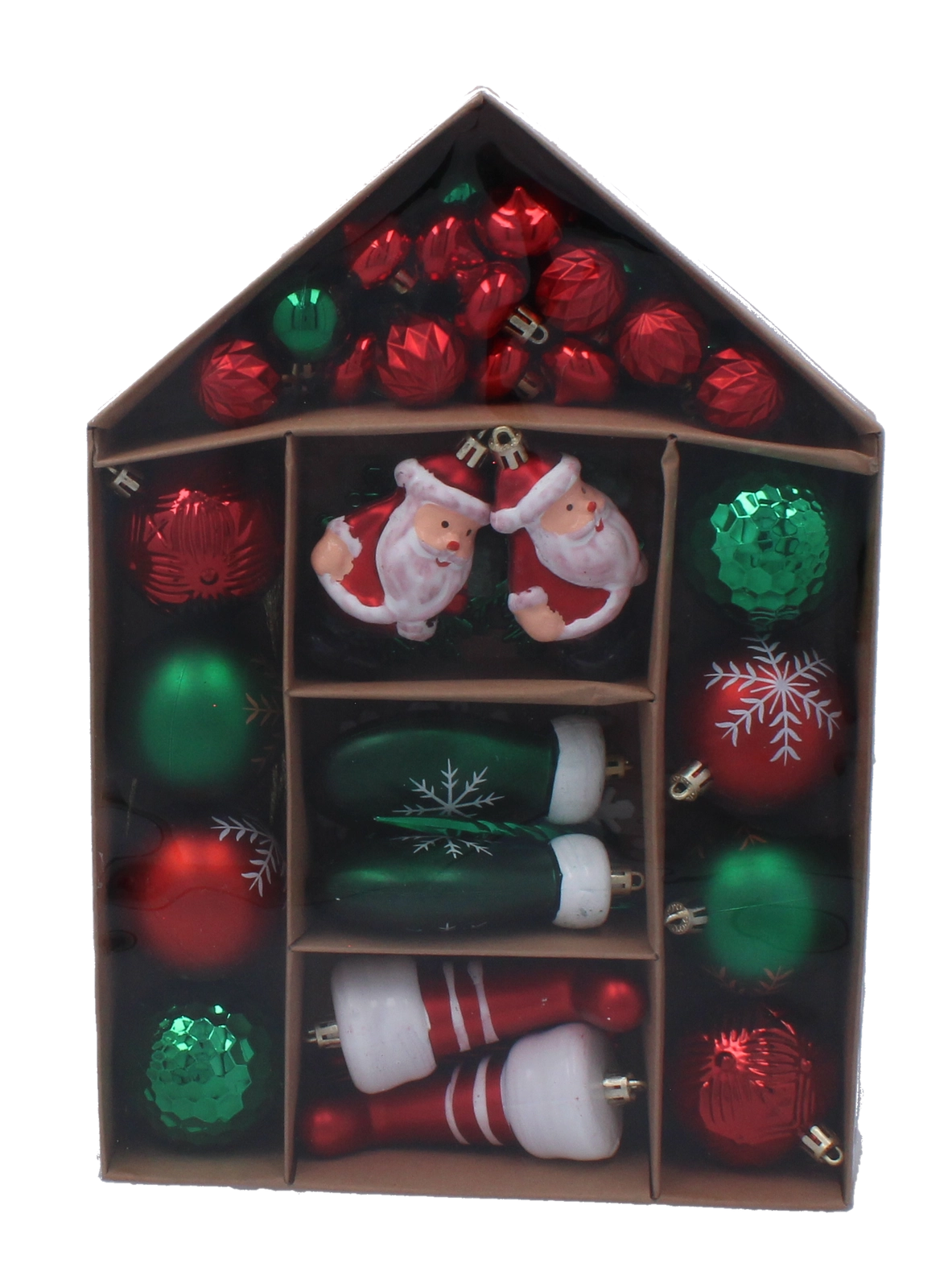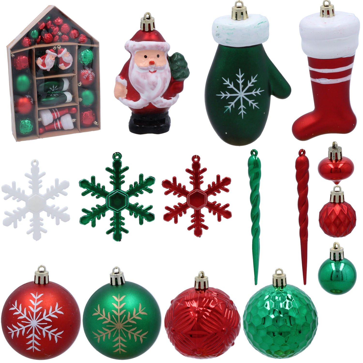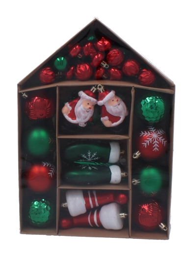 Ez a gazdag karácsonyi díszszett harmonikus, ünnepi dekorációvá varázsolja a fádat. A formák mixe – gömböcskék, hópelyhek, jégcsapok, zoknik, kesztyűk és Mikulás figurák – megteremti a hagyományos ünnepi hangulatot, és tökéletesen kiegészíti az otthoni dekorációkat.