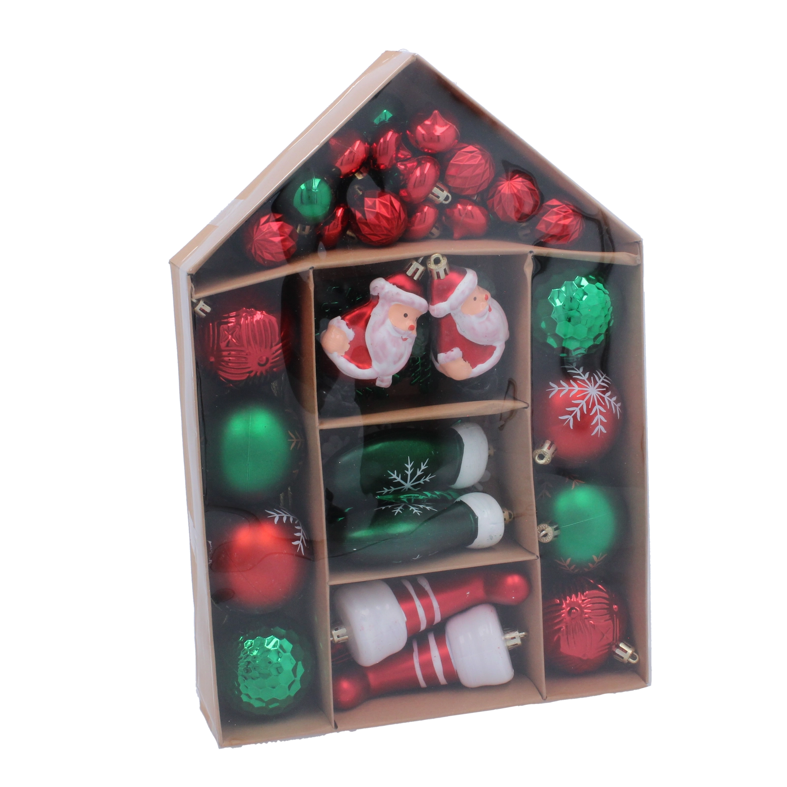 A díszek minőségi, törésálló műanyagból készültek, így ideálisak gyermekek és háziállatok mellé is. A könnyű kivitel kíméli az ágakat, a felfüggesztő füleknek köszönhetően pedig a díszítés gyors és kényelmes. Az átlátszó, házikó formájú, fogantyús doboz mindent áttekinthetően rendszerezve tart, és megkönnyíti a szállítást és az ünnepek utáni tárolást.