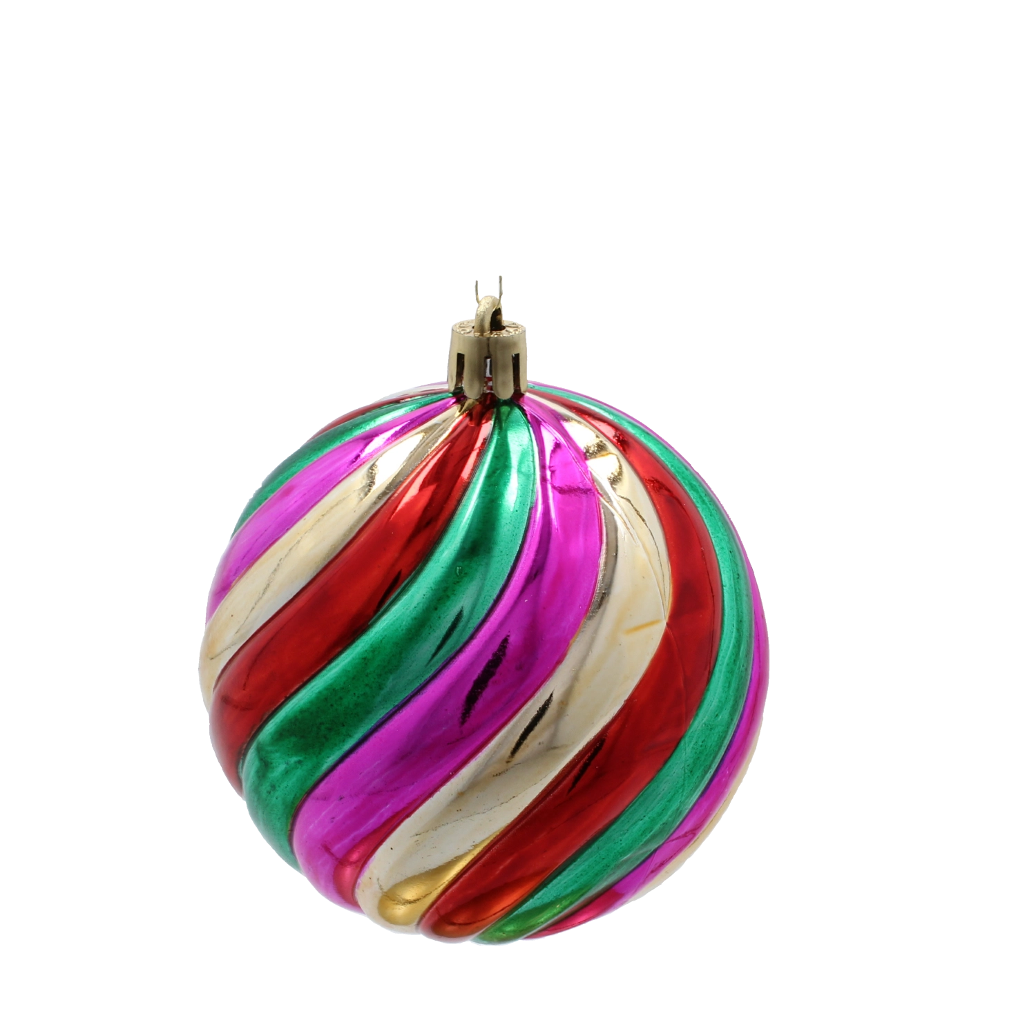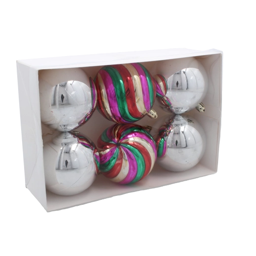 Elegáns, 6 darabos, 8 cm átmérőjű karácsonyi gömbkészlet, amely díszítésének stílust és csillogást kölcsönöz. Minden gömb egyedi mintával rendelkezik – a tükörfényes ezüsttől a színes spirálokig – harmonikus, mégis változatos kompozícióért. A törhetetlen műanyagnak köszönhetően biztonságos és tartós, könnyű felakasztani, és ideális gyerekekkel vagy házi kedvencekkel élő otthonokba.