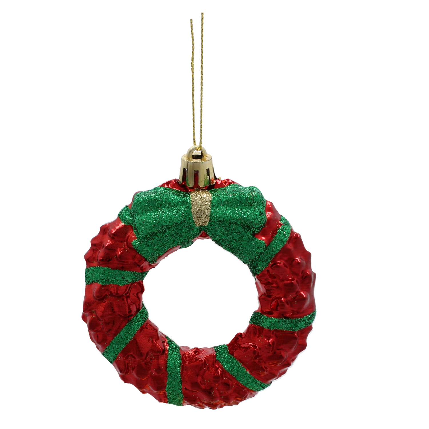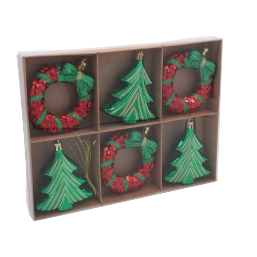 Add meg a fádnak az ünnepi ragyogást ezzel a hatdarabos díszszettel, amely koszorú és fenyőfa formájú, 8 cm átmérőjű díszekből áll. A könnyű és tartós műanyag egyszerű felakasztást biztosít anélkül, hogy terhelné az ágakat, míg a fényes és csillogó részletek harmonikus, elegáns megjelenést kölcsönöznek a teljes dekorációnak.