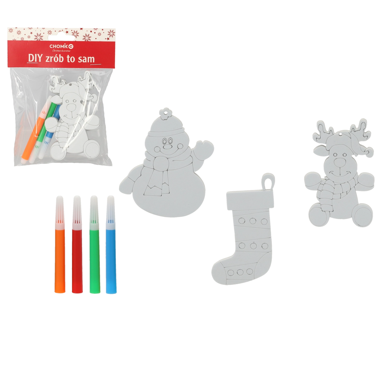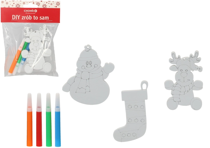 - 3 akasztható dísz (hóember, rénszarvas, harisnya) + 4 színes filctoll