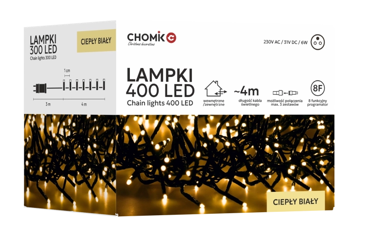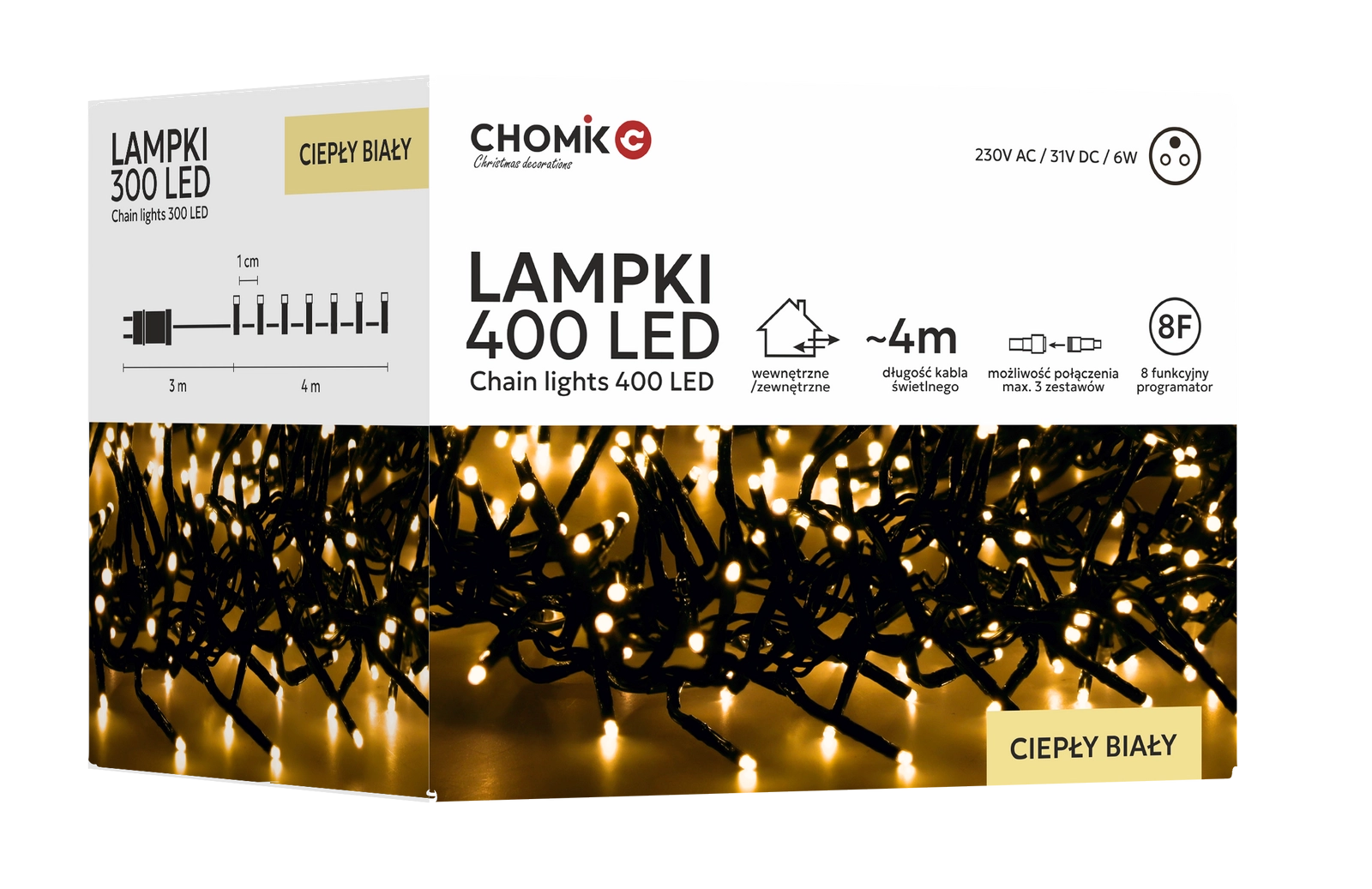 A 400 diódás LED Cluster füzér látványos, sűrű fényt ad, amely remekül mutat a karácsonyfán, korláton, falon vagy a kertben. A meleg fehér szín otthonos hangulatot teremt, a vezérlő memóriájának és időzítőjének köszönhetően pedig kedvenc üzemmódját könnyedén beállíthatja anélkül, hogy újra kellene programozni.
