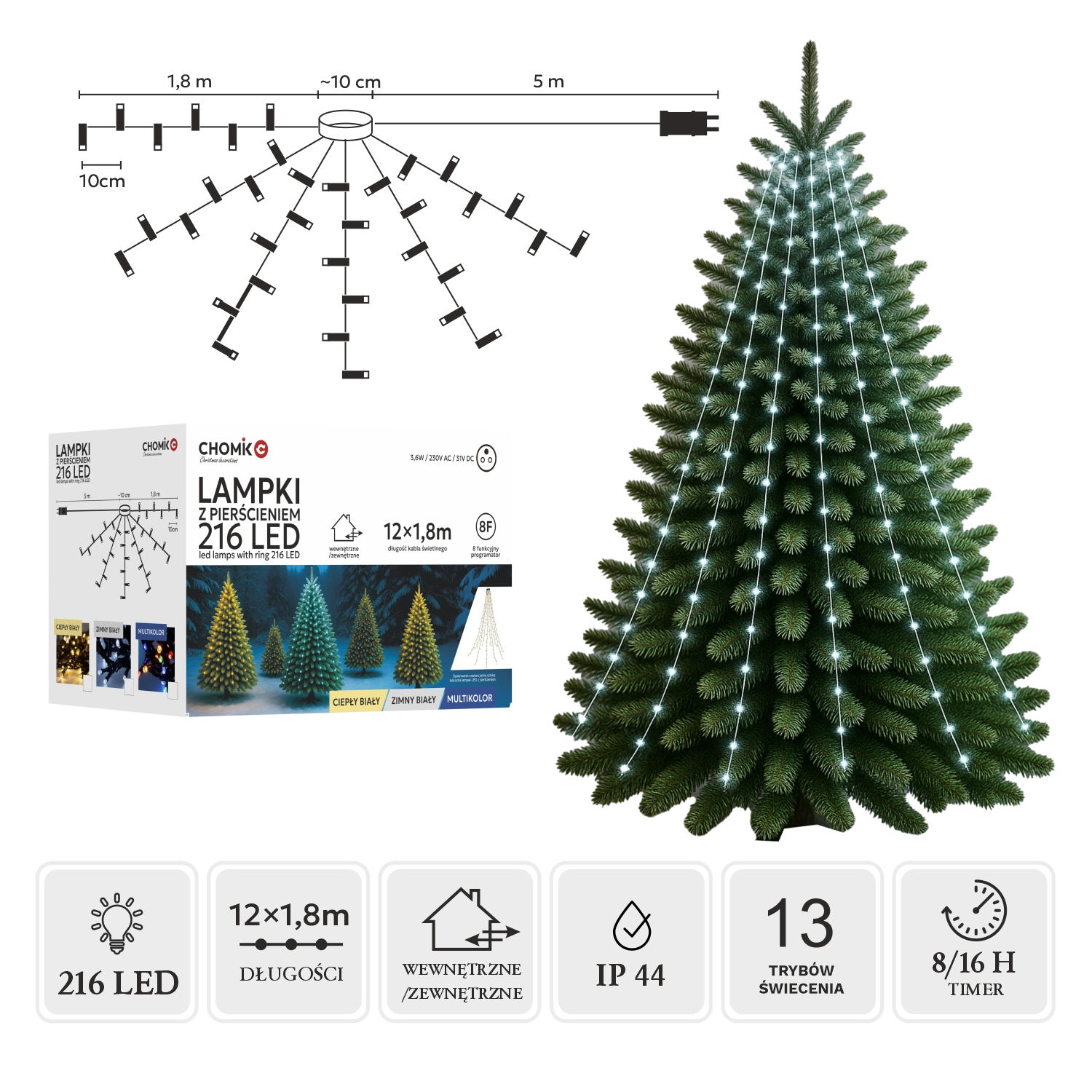 Elegáns LED fényfüzér gyűrűvel, 1,8 m hosszban, összesen 216 LED-del hideg fehér színben, amely varázslatos téli hangulatot teremt otthon és a kertben is. Az IP44 védettségnek köszönhetően beltéri és kültéri használatra egyaránt alkalmas, a zöld kábel beleolvad a fák ágaiba, a praktikus 8 funkciós vezérlő memóriával és 8/16 órás időzítővel pedig kényelmes kezelést és látványos fényprogramokat kínál.