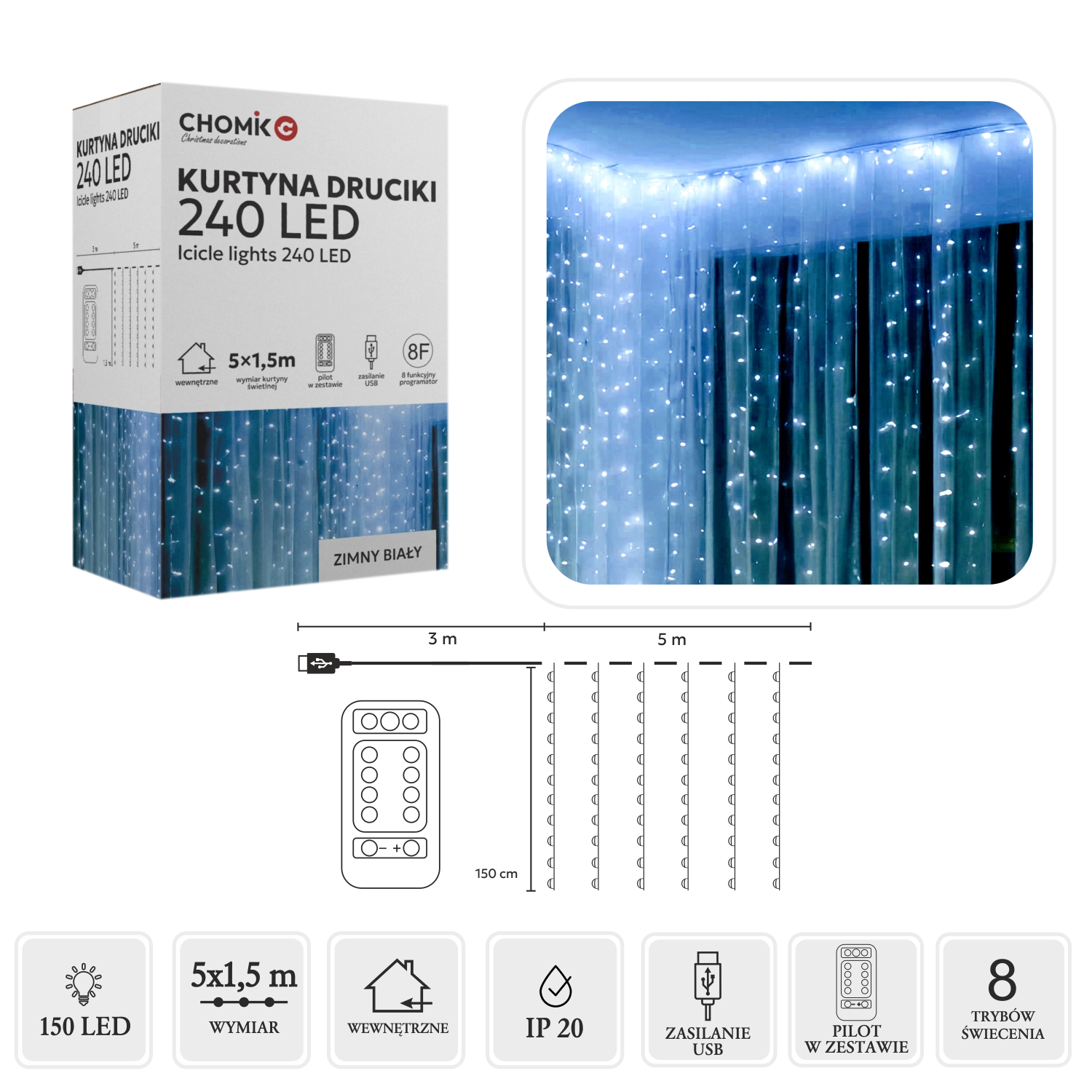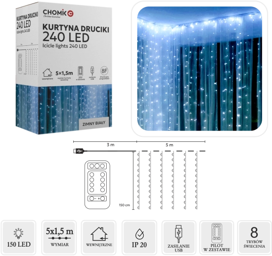 Elegáns fényfüggöny mikro LED-ekkel hideg fehér színben, amely jeges csillogást varázsol ablakokra, falakra és erkélyekre. 240 LED-et kínál 5 × 1,5 m felületen, praktikus USB tápellátással és távirányítóval, 8 fényprogrammal. A IP44 védettségnek köszönhetően beltérre és kültérre egyaránt alkalmas, az ezüstszínű vezeték pedig finomságot és eleganciát kölcsönöz a dekorációnak.