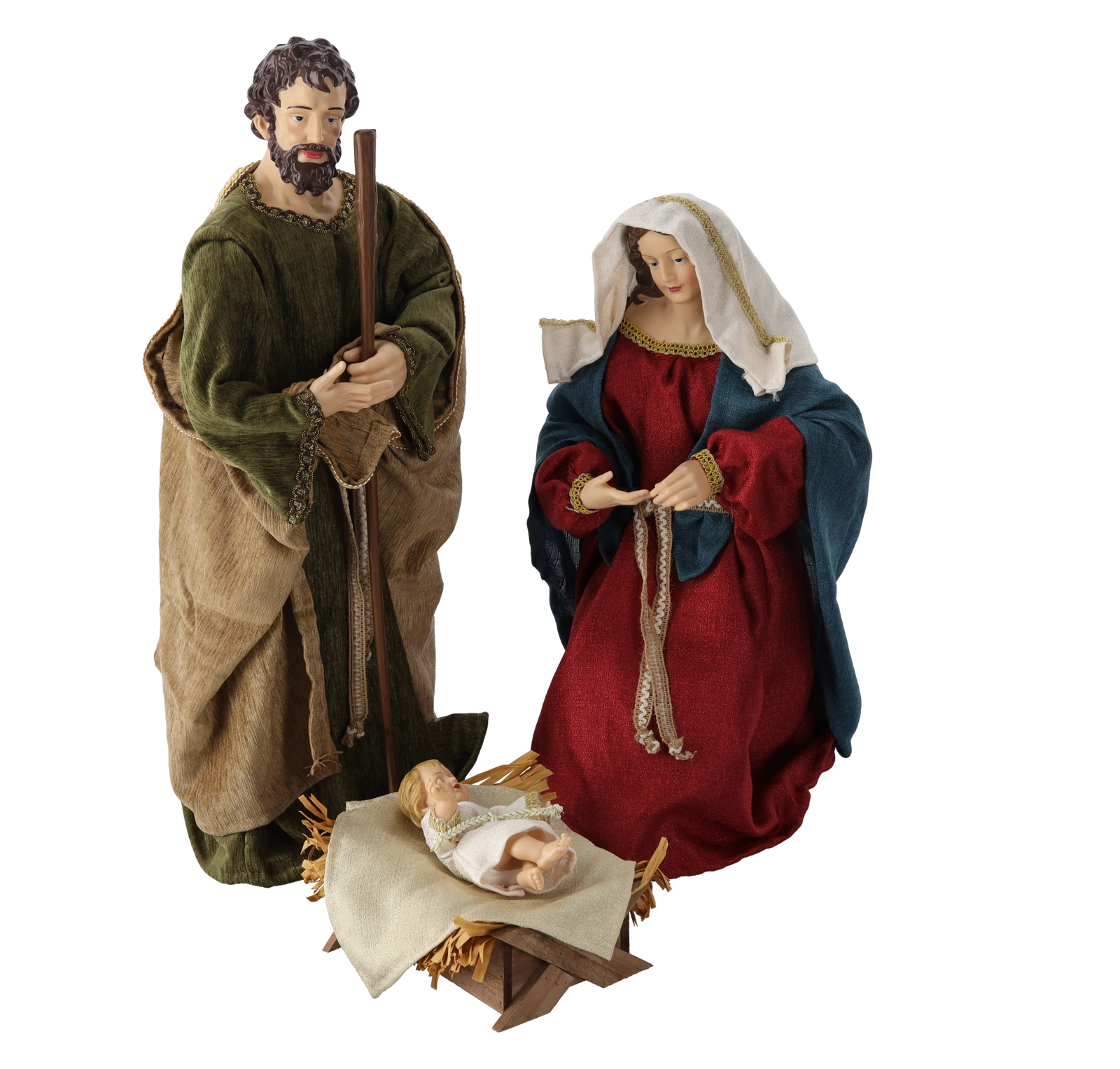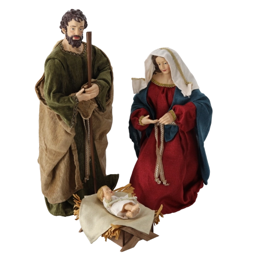 - 3 figurából álló készlet: József, Mária és a Kisjézus harmonikus Születés-jelenetet alkotnak.