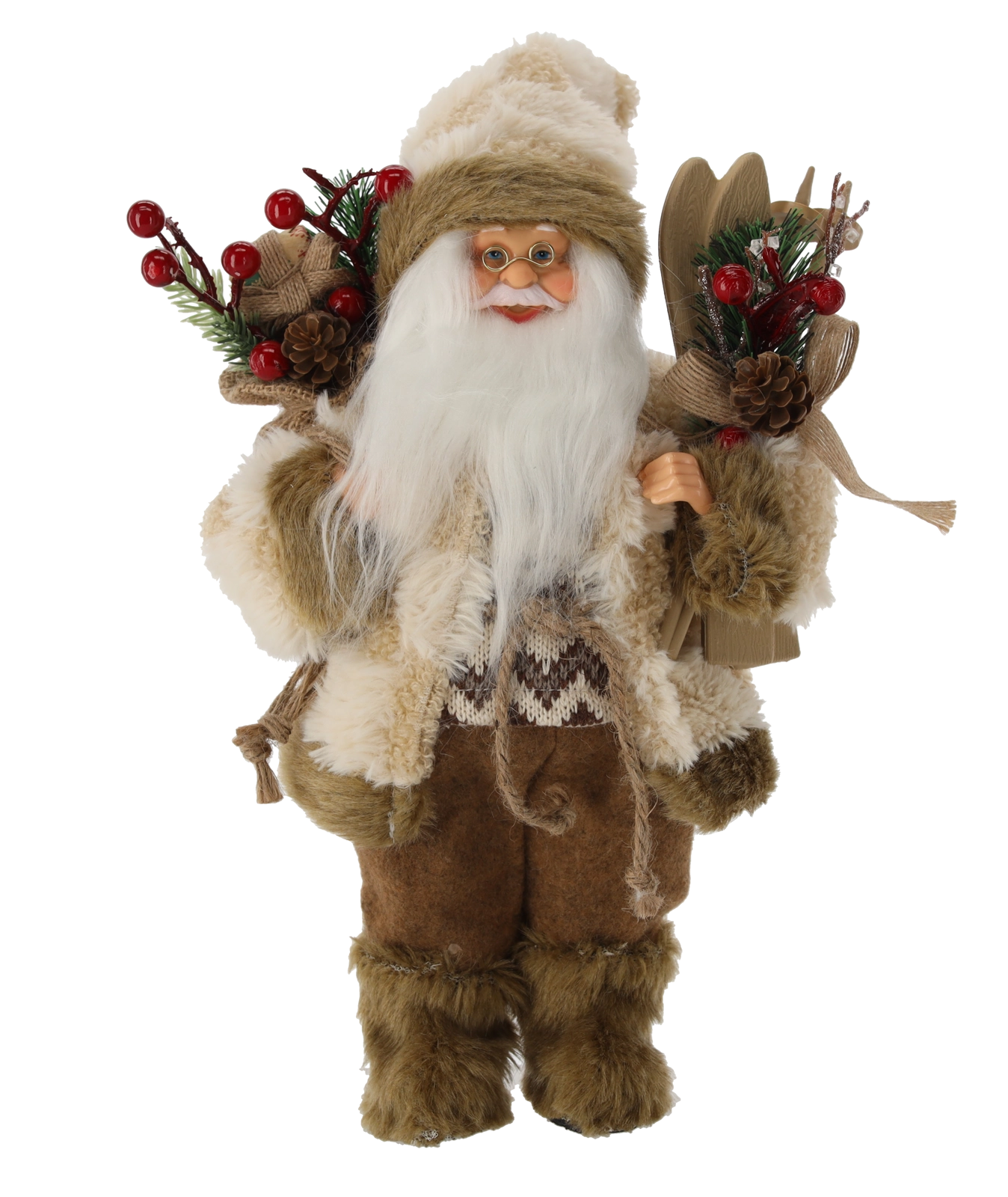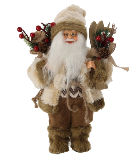 Elegáns karácsonyi dekoráció, amely meleg, ünnepi hangulatot visz a térbe. A bézs kabátos, álló Mikulás sílécekkel a kezében részletgazdag kidolgozásával, semleges színvilágával és stabil talapzatával tűnik ki a biztonságos elhelyezés érdekében. Ideális polcra, komódra vagy karácsonyi asztalra.