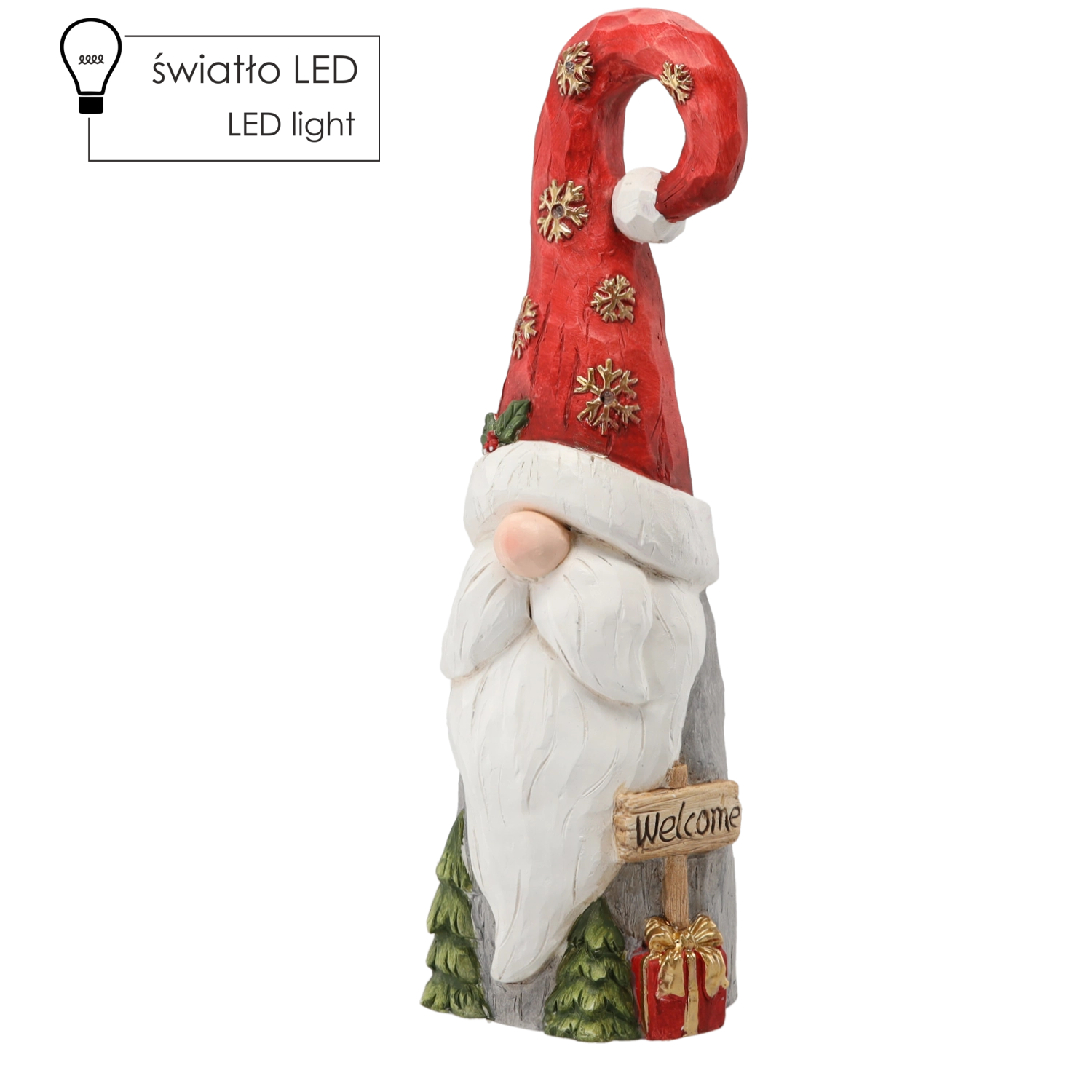 A beépített LED-világítás finom fényt ad a dekorációnak, és kiemeli a manó részleteit. Ideális esti meghittséghez erős fény nélkül.