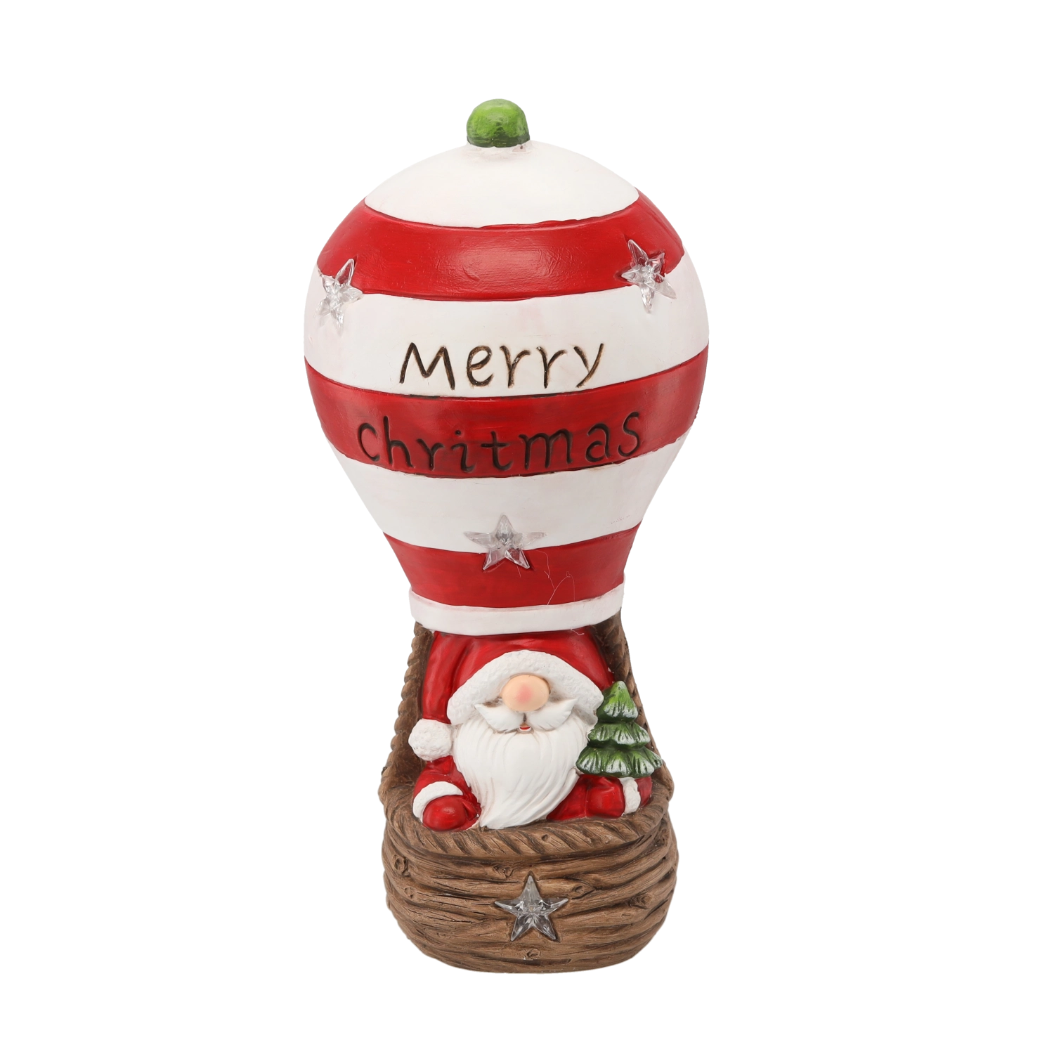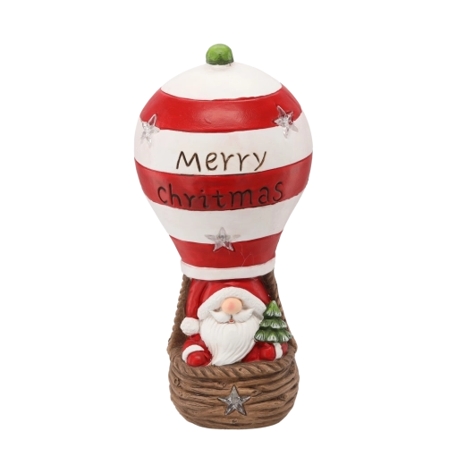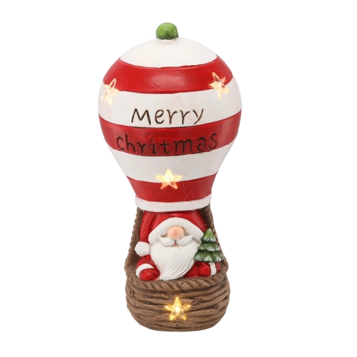 Ez a karácsonyi figura az ünnepek varázsát hozza el: Mikulás piros–fehér csíkos hőlégballonban, „Merry Christmas” felirattal. A beépített LED fények lágy, meleg fényt adnak, meghitt ünnepi hangulatot teremtve bármely helyiségben.