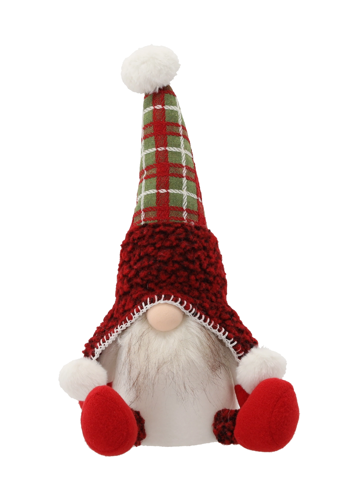 A kockás sapka, a bolyhos szakáll és a puha anyagok időtálló megjelenést kölcsönöznek a dekorációnak. Remekül mutat polcokon, komódokon és kandallópárkányon is.