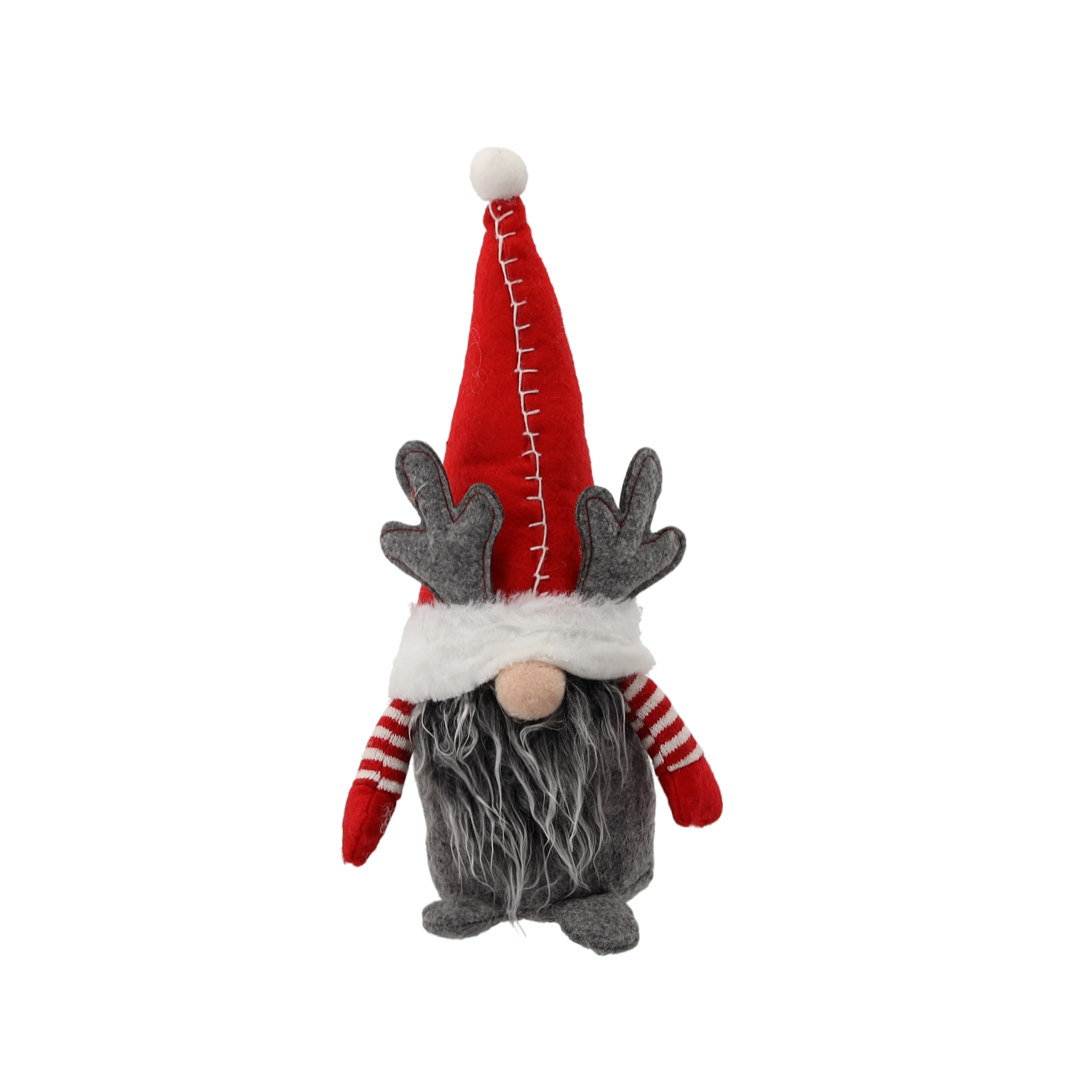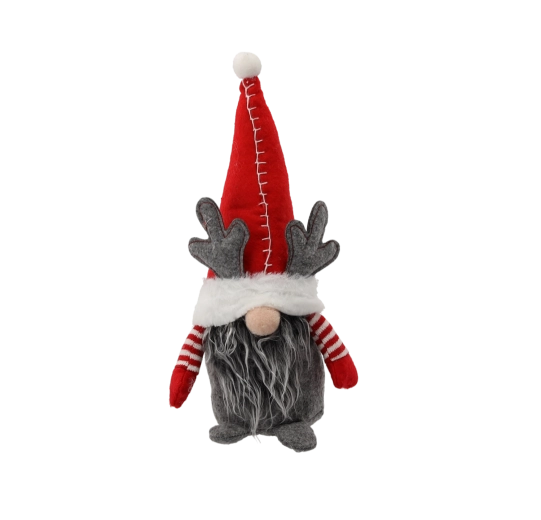 Ez a rénszarvas stílusú dekoratív manó magas, fehér szegélyű sapkájával, szürke agancsaival és hosszú, puha szakállával hívja fel magára a figyelmet. A puha textilanyagoknak és a gondos kidolgozásnak köszönhetően ideális szezonális dísz a nappaliba, előszobába vagy akár irodába is.