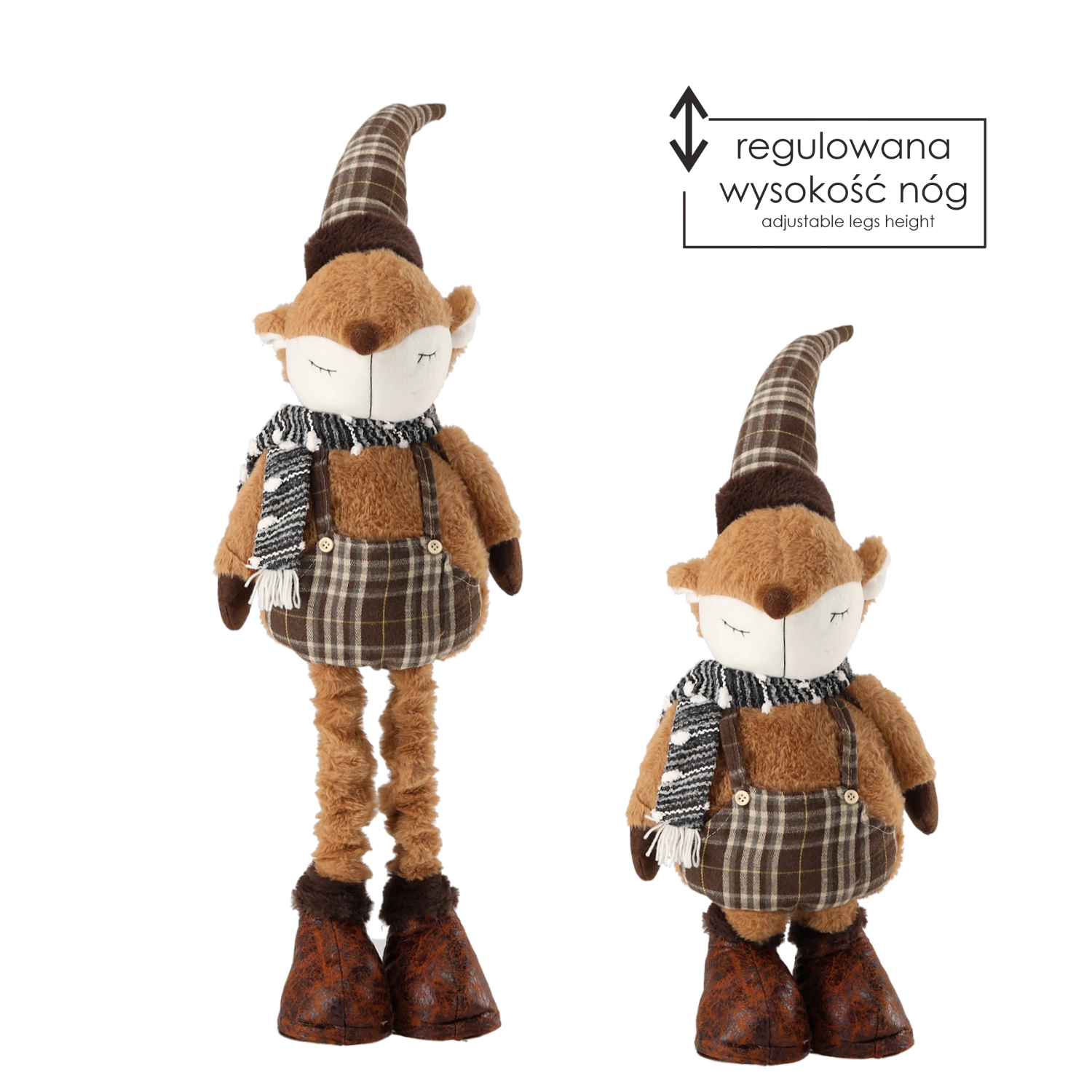 Bájos karácsonyi dekoráció róka formában, amelyet a teleszkópos lábaknak köszönhetően könnyedén beállíthat 65 és 100 cm között. A stílusos hagyományos karácsonyi színek, a minőségi anyagok és a precíz kidolgozás tartós és időtálló díszt varázsolnak belőle bármelyik enteriőrbe.