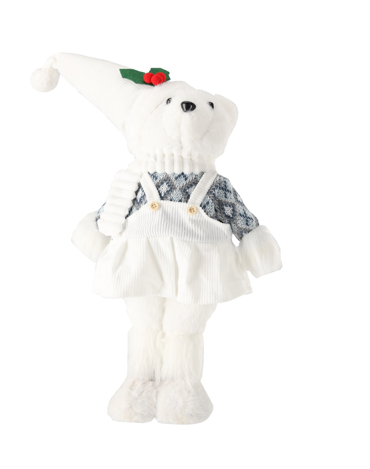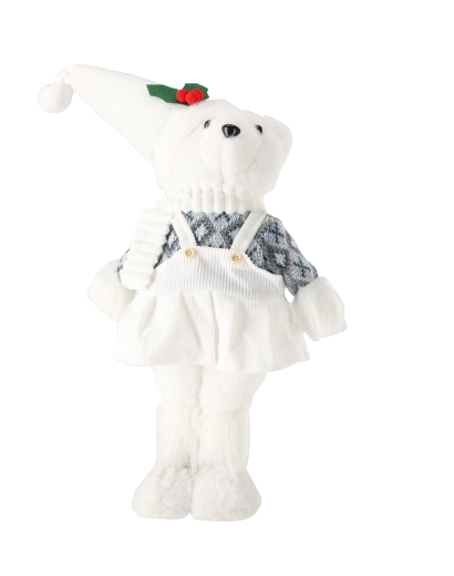 Ez a bájos mackó puha megjelenésével, téli öltözetével és lógó lábaival hívja fel magára a figyelmet, így szépen mutat polcon vagy kandallón is. Az 50 cm-es magasságnak köszönhetően dekorációjának feltűnő darabja lesz, és örömet szerez kicsiknek és nagyoknak egyaránt.