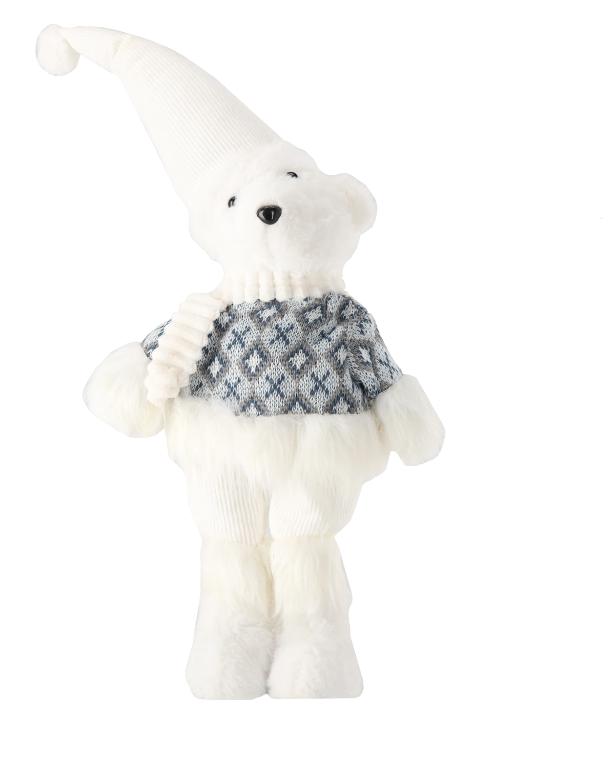 A mackó puha tapintású felületével, hosszú hegyes sapkájával és mintás pulóverével hódít. A biztonságosan hímzett részletek bájos és otthonos hatást keltenek.