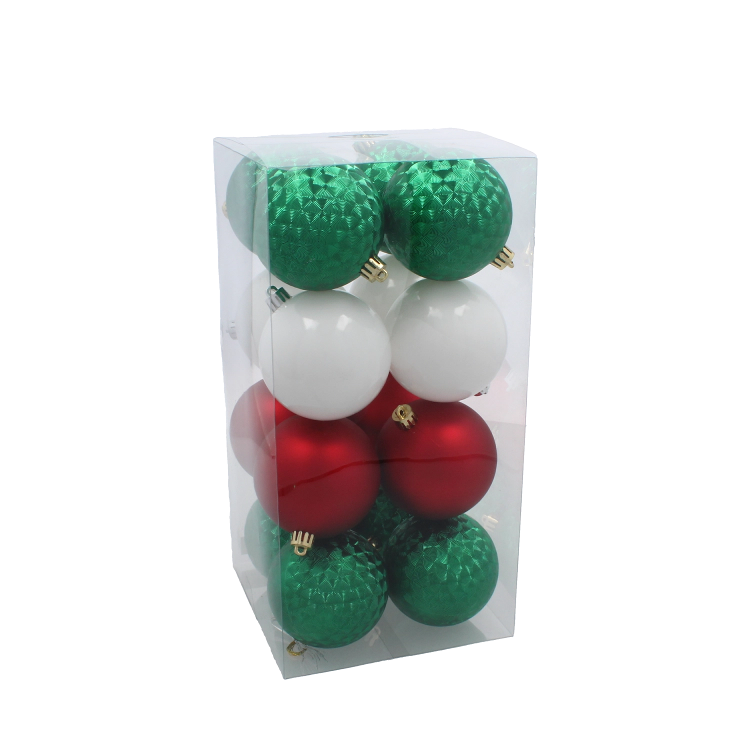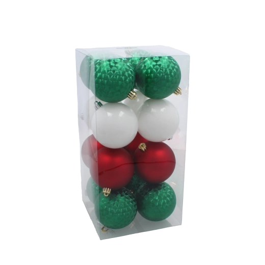 Stílusos, 16 darabos, 8 cm átmérőjű karácsonyi gömbszett piros, zöld és fehér színben, amely hagyományos és elegáns megjelenést kölcsönöz a fának. A matt és fényes felületek kombinációja gyönyörű csillogást hoz létre a fényben. A tartós műanyag anyag gyermekek és háziállatok számára is biztonságos, és hosszú élettartamot biztosít. A csomag része a praktikus tárolódoboz az egyszerű elhelyezéshez.