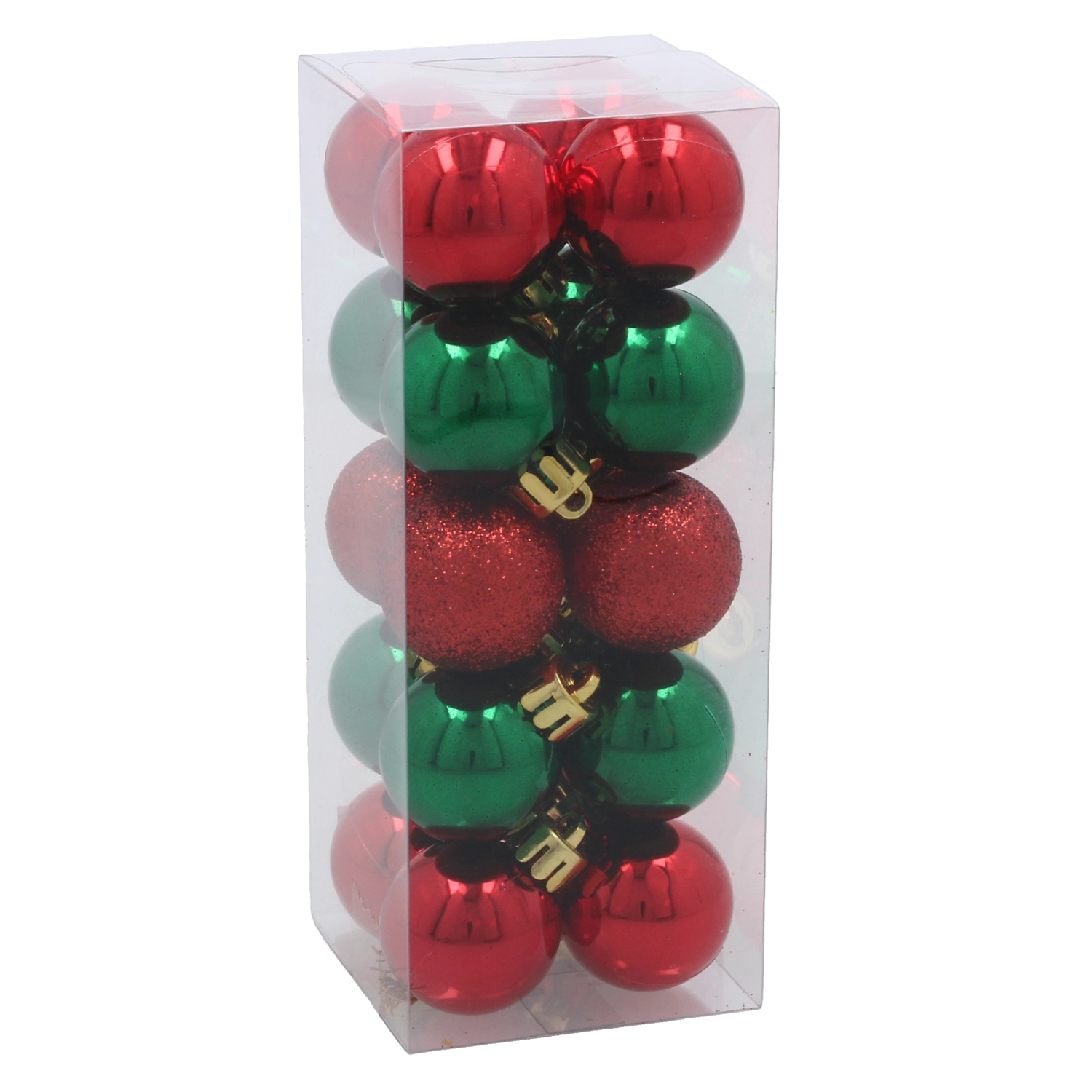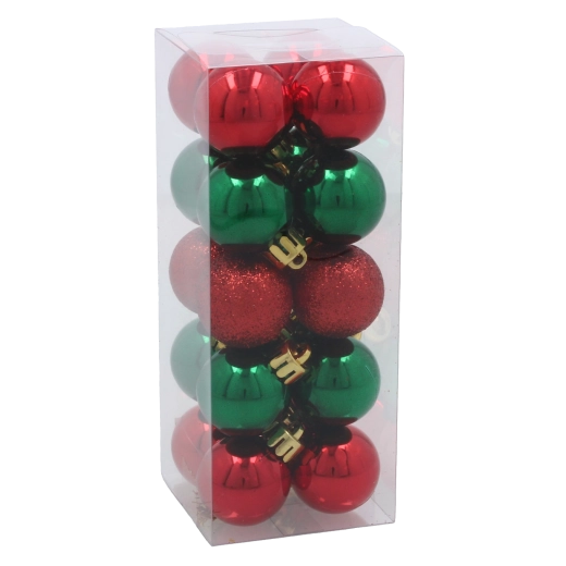 Ez a 3 cm-es karácsonyi gömbkészlet a piros és zöld klasszikus párosításában hagyományos, elegáns megjelenést kölcsönöz a fának és a belső térnek. A könnyű, mégis tartós műanyag hosszú élettartamot, biztonságos használatot és egyszerű kezelhetőséget biztosít.