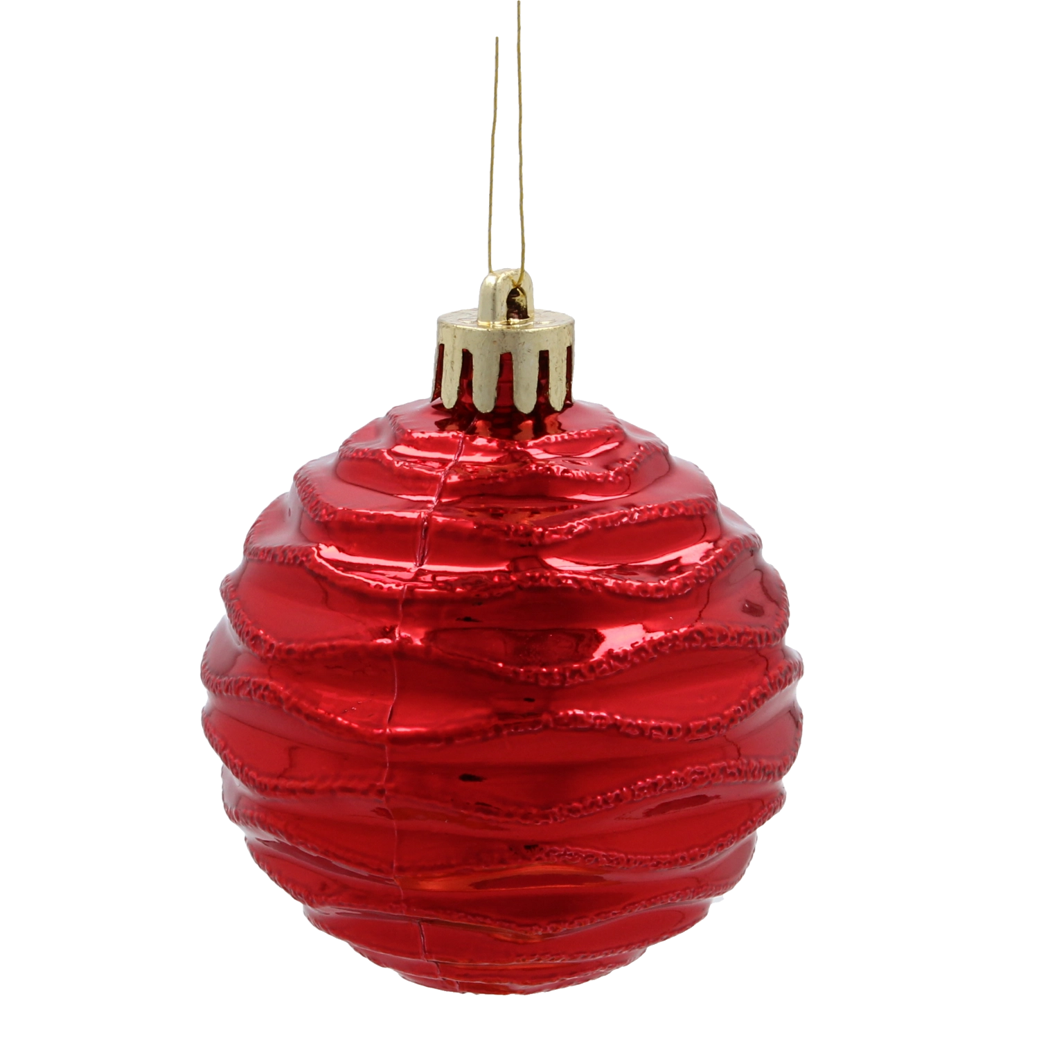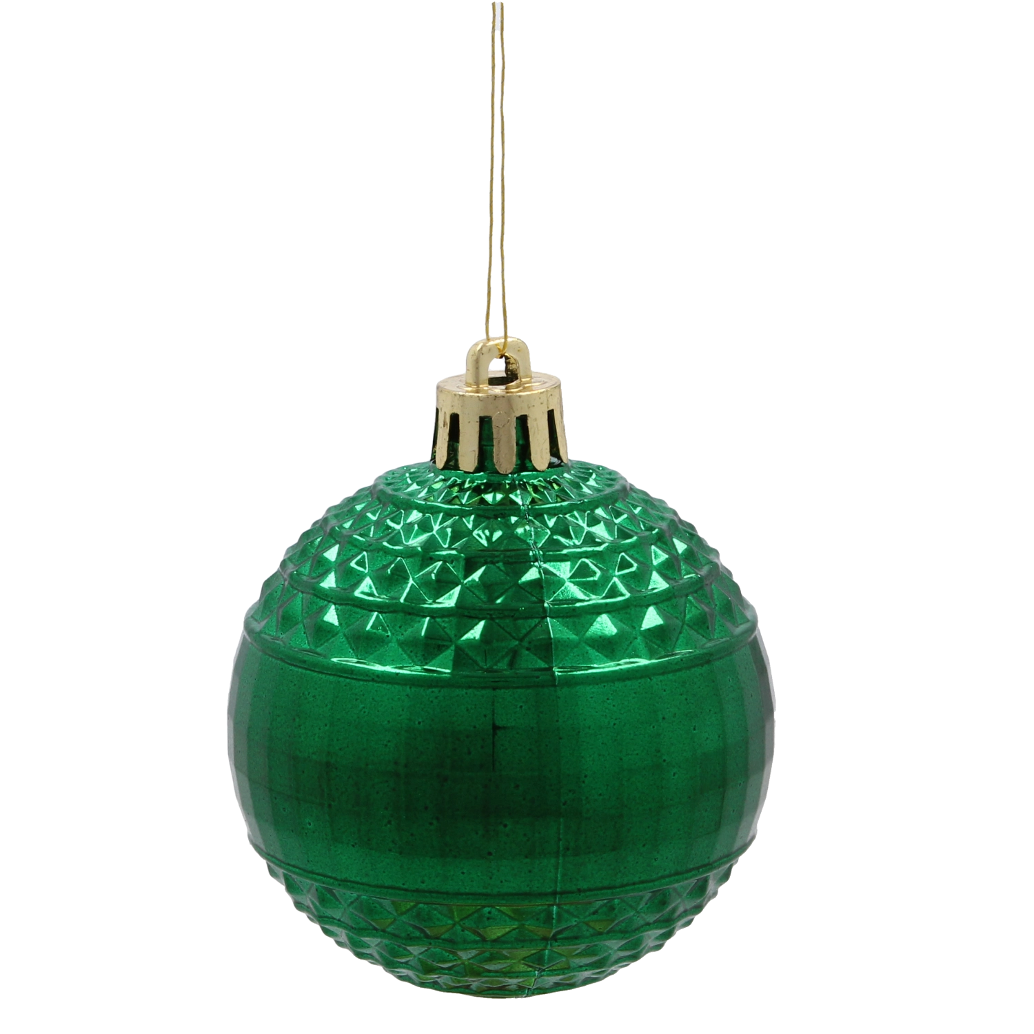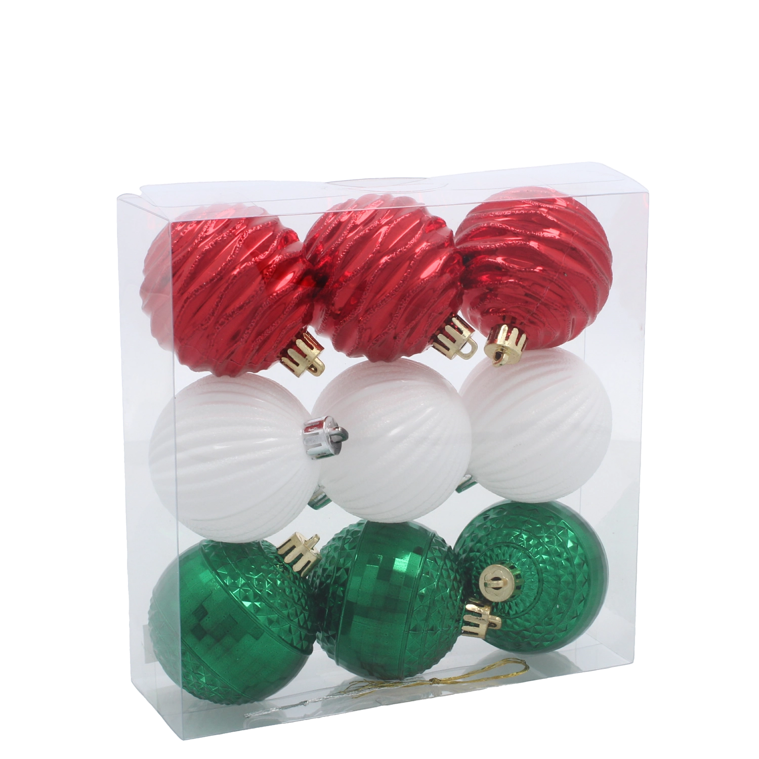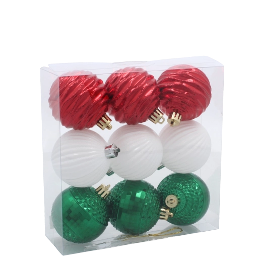 Teremtsen otthon hagyományos és elegáns karácsonyi hangulatot 9 darab, 6 cm átmérőjű műanyag díszből álló szettel piros, zöld és fehér színekben. A könnyű és tartós anyag biztonságos gyermekek és háziállatok számára, minden gömb zsinórral rendelkezik az egyszerű felakasztáshoz, a különböző textúrák pedig látványos csillogást adnak a fán.