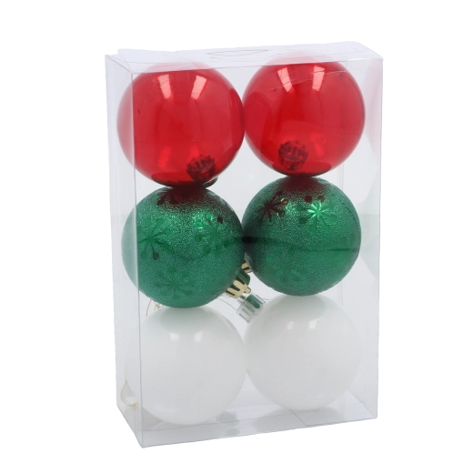 Elegáns, hatdarabos karácsonyi gömbszett 6 cm átmérővel a hagyományos piros, zöld és fehér színekben. Törésálló műanyagból készült a biztonságos és hosszú távú használatért. Ideális a karácsonyfára, koszorúkra, girlandokra és egyéb dekorációkra – klasszikus ünnepi megjelenést és ragyogó fényt ad a belső térnek.