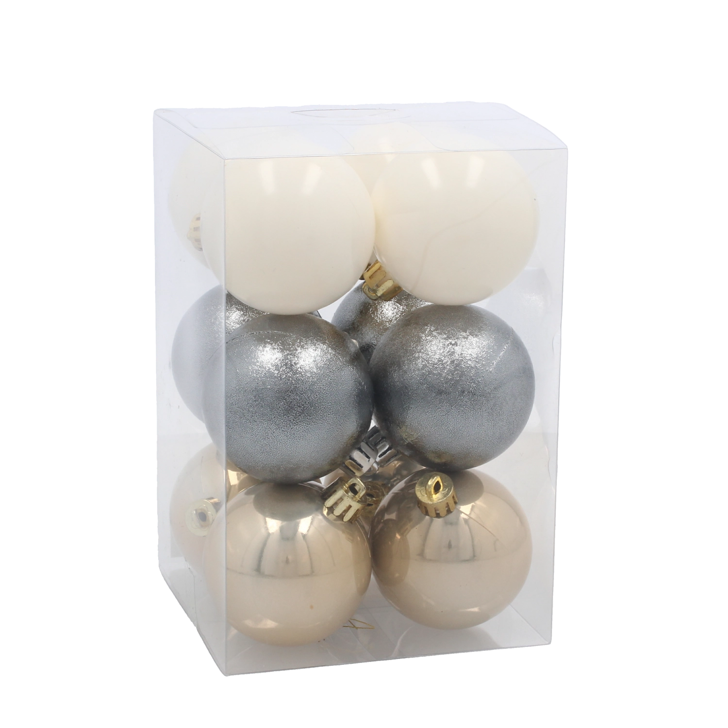 12 darabos karácsonyi gömb szett, 6 cm – pezsgő, ezüst és fehér