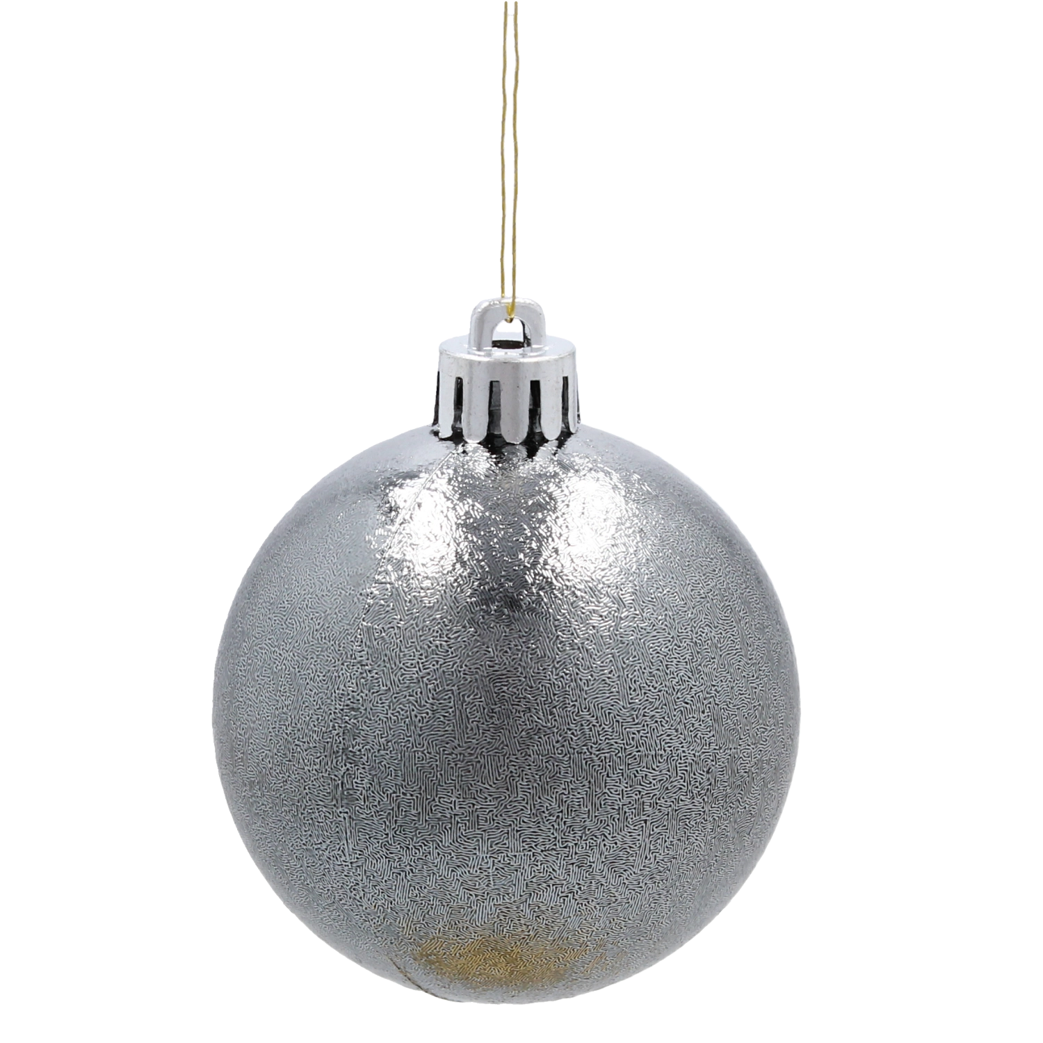 Elegáns, 12 darabos karácsonyi gömbszett 6 cm átmérővel, pezsgő, ezüst és fehér árnyalatokban, amely harmonikus megjelenést kölcsönöz a fának. Törésálló műanyagból készült a nagyobb biztonság érdekében, és praktikus akasztófüllel rendelkezik az egyszerű felhelyezéshez. A könnyű anyag nem terheli túl az ágakat, így a díszítés klasszikus és modern enteriőrben egyaránt kényelmes.