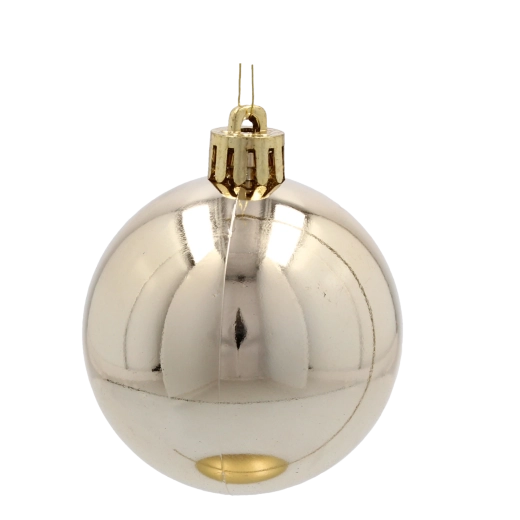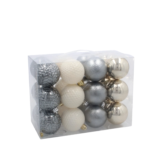 Elegáns, 24 darabos, 6 cm átmérőjű karácsonyi gömbszett pezsgő, szürke és fehér árnyalatokban, amely beragyogja a fát és a belső teret. A könnyű és tartós műanyag díszek biztonságosak és hosszú élettartamúak, fényes, matt és csillogó felületek kombinációjával kifinomult és harmonikus dekorációt teremtenek. A praktikus műanyag csomagolás megkönnyíti a szezonon kívüli tárolást.