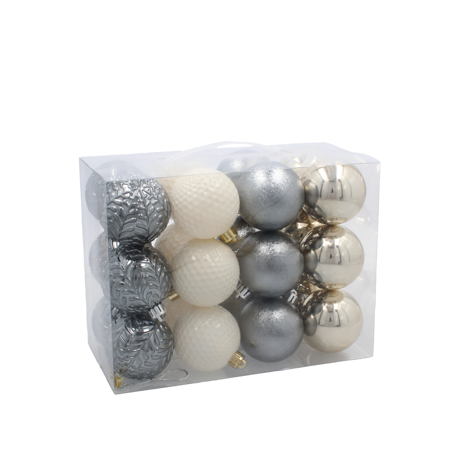 Adjon időtlen eleganciát az ünnepeknek. Ez a gondosan összehangolt, 24 darabos műanyag gömbszett pezsgő, szürke és fehér színekben kiegyensúlyozott kombinációt kínál a fényes, matt és csillogó felületekből, amelyek mélységet, fényjátékot és prémium megjelenést biztosítanak.