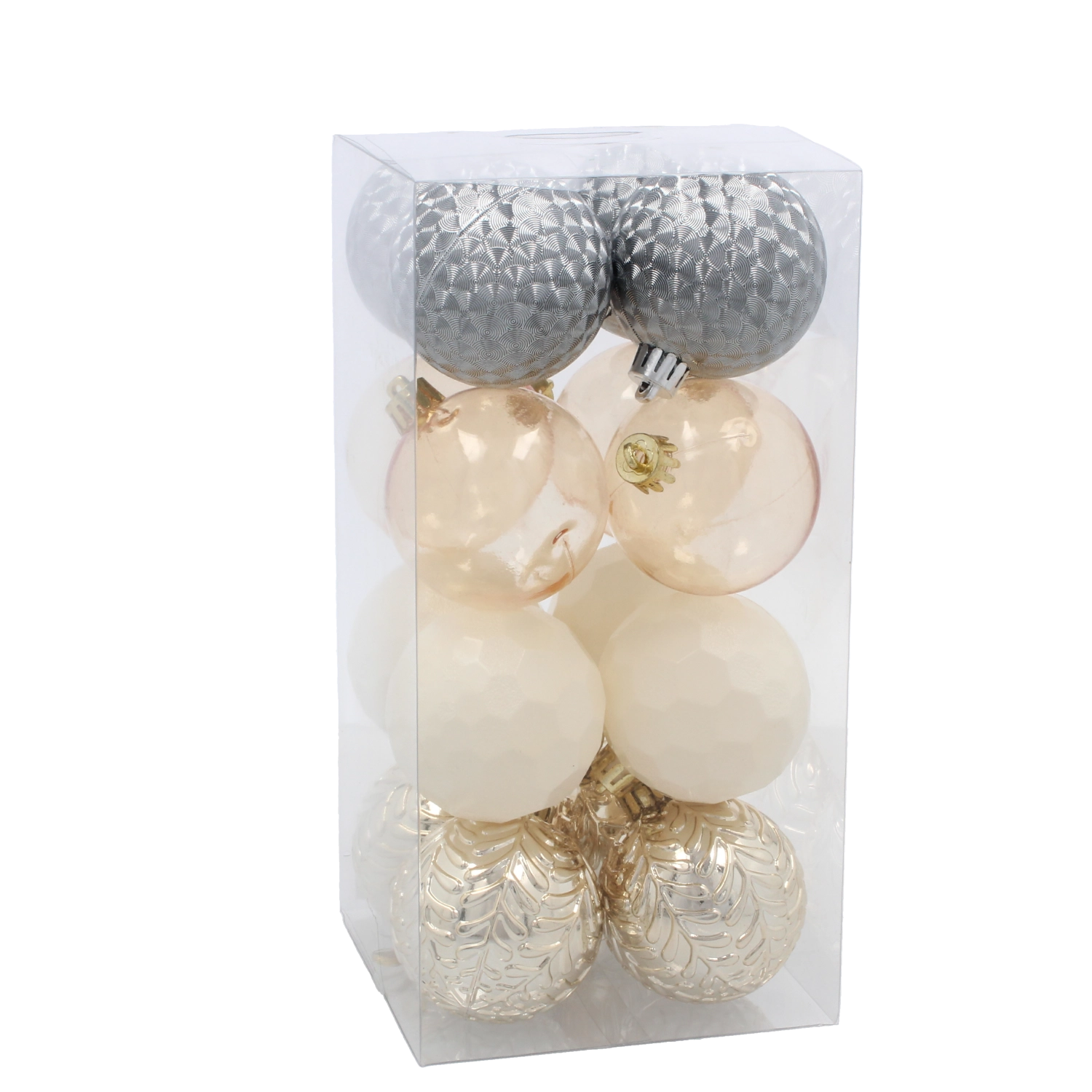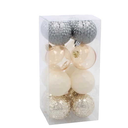Alkossa meg a tökéletesen összehangolt karácsonyi díszítést a CHOMIK 16 darabos szettjével a pezsgő, szürke és fehér időtálló tónusaiban. A sima és díszített felületek kombinációja luxus és modern karaktert kölcsönöz a fának és a dekorációknak, amely remekül illeszkedik a hagyományos és kortárs enteriőrökhöz is.
