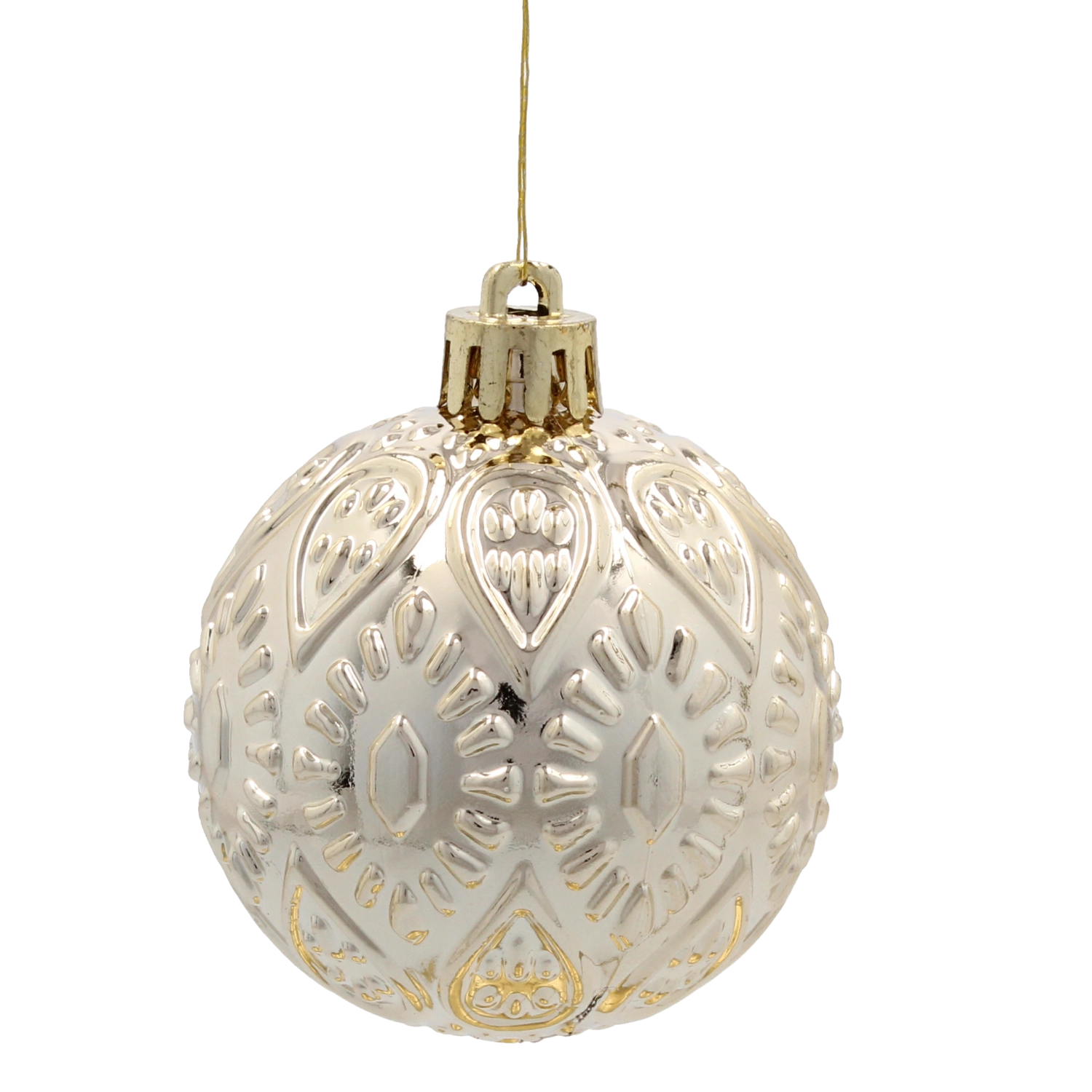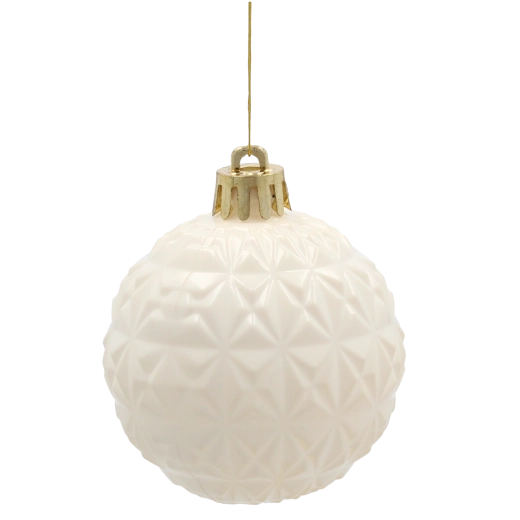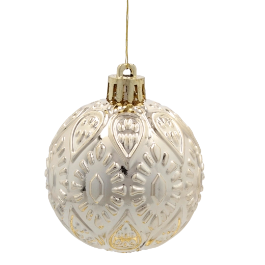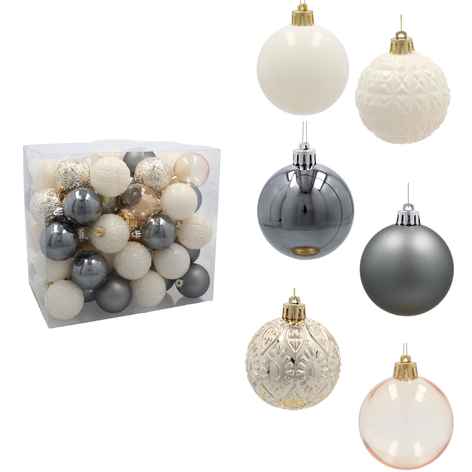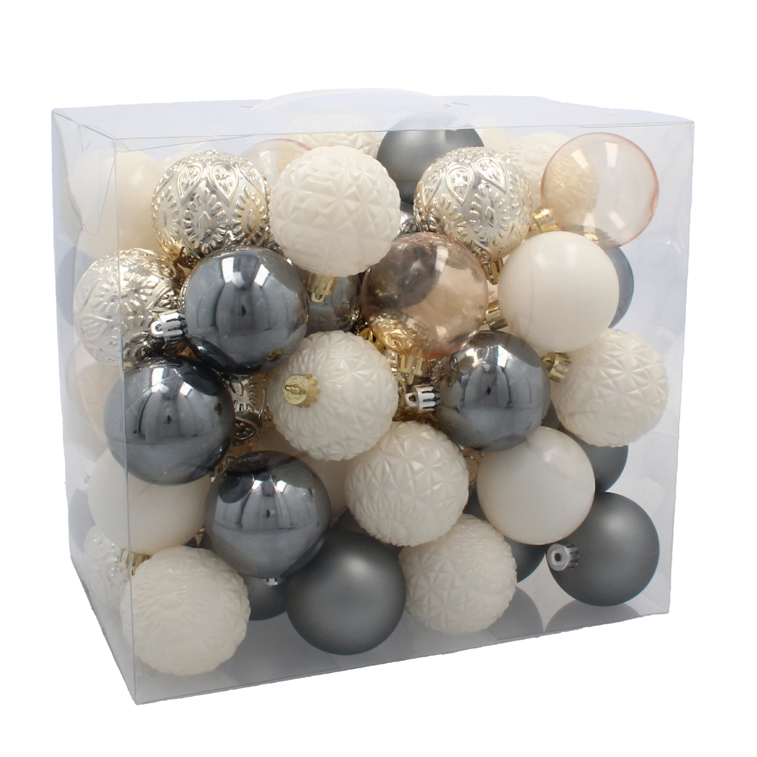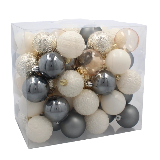 Elegáns 66 darabos karácsonyi dísz készlet 6 cm átmérővel, pezsgő, szürke és fehér tónusokban, amely harmóniát és stílust kölcsönöz a fának. A tartós műanyag biztonságos használatot garantál, míg a fényes, matt és csillogó felületek mélységet és ünnepi ragyogást visznek minden enteriőrbe.