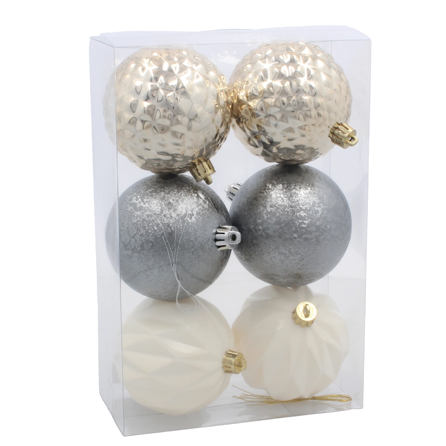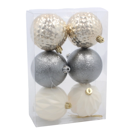 8 cm-es üveg karácsonyi gömbök szettje – pezsgő, ezüst és fehér, 6 db