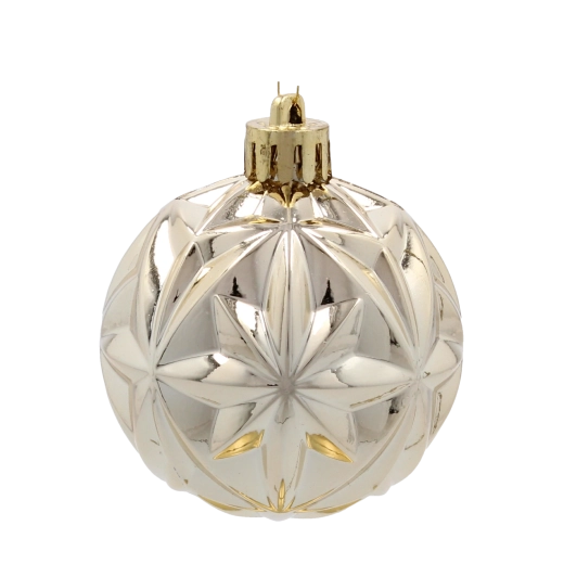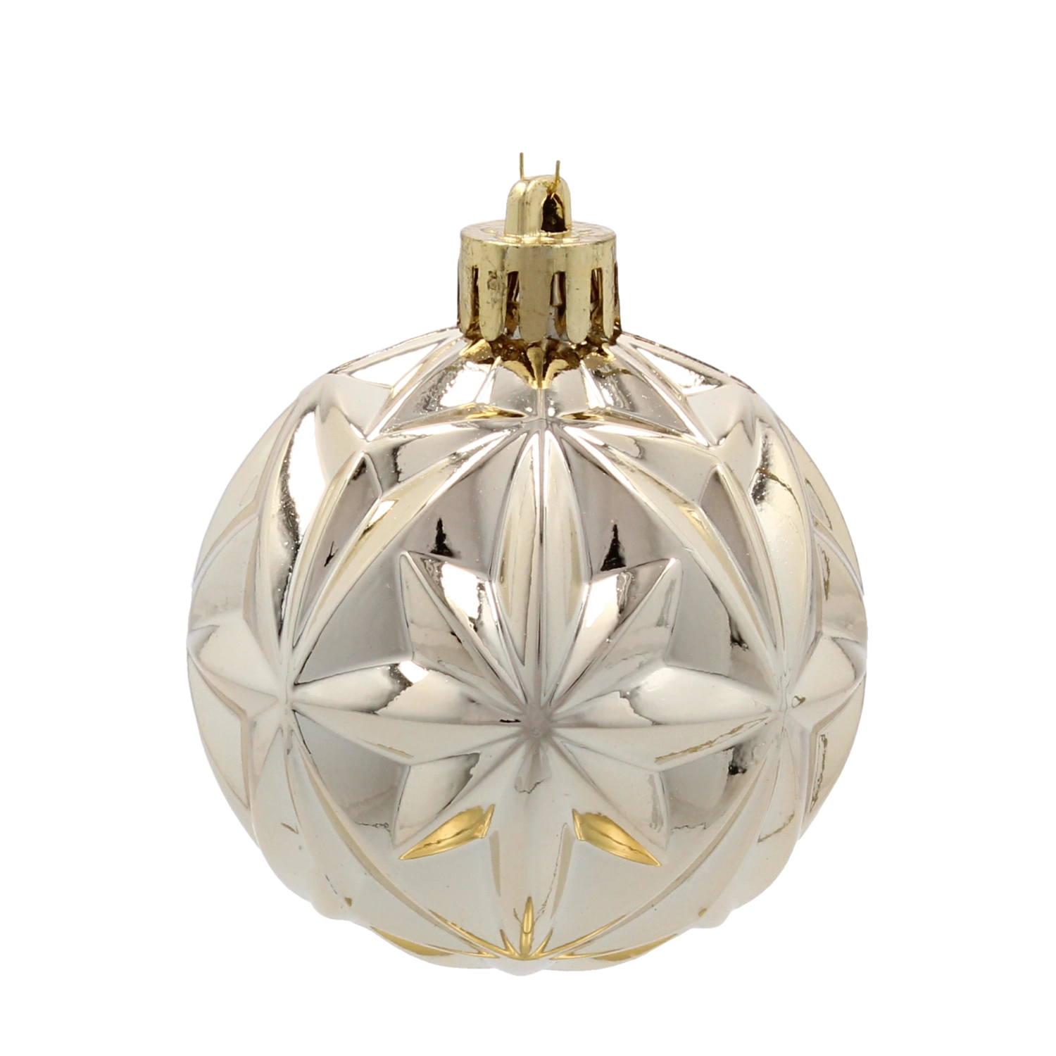 A domború csillagmotívum az ezüstös gömbön fényjátékot kelt, és karakteres struktúrát ad a fának.