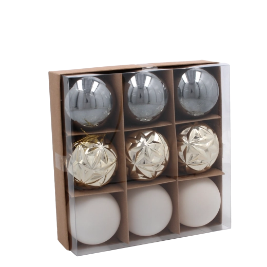 Ez a 9 darabos karácsonyi díszszett harmonikus, semleges tónusokat hoz, amelyek könnyen illeszkednek a hagyományos és modern dekorációkhoz egyaránt. A felületi változatosság – a matt simától a díszítetten át a fényesig – látványos kontrasztot és luxus hatást teremt a fán.