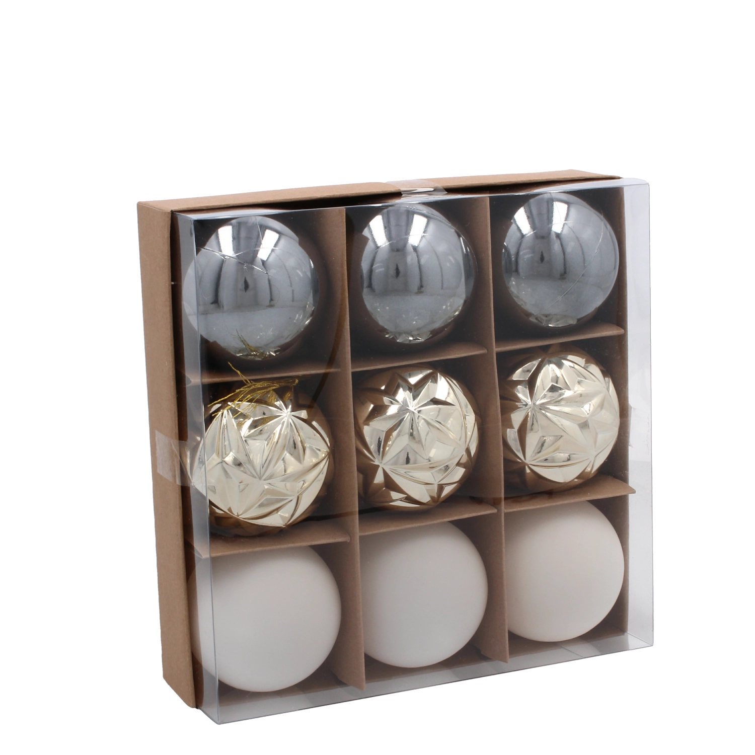 6 cm-es karácsonyi gömbszett pezsgő-, szürke- és fehér árnyalatokban – 9 db