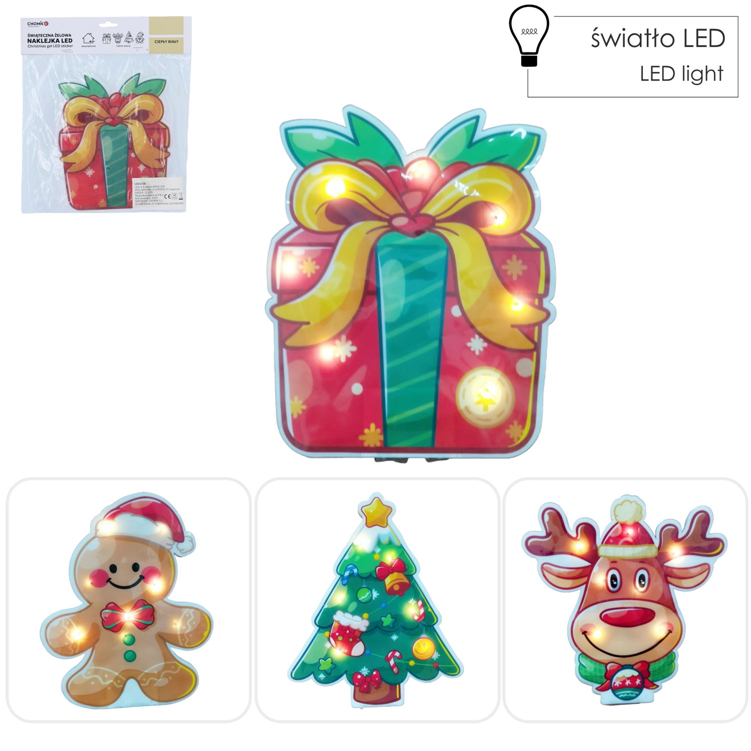Varázsold otthonodat karácsonyi hangulattal a dekoratív zselés LED matricával. Válaszd a fenyőfa, ajándék, rénszarvas vagy mézeskalács figura motívumát, és teremts meghitt atmoszférát meleg fehér fénnyel. A matrica könnyen rögzíthető üvegre, tükörre vagy bútorra, elemmel működik, és nem igényel kábeleket. Gyors dekoráció ablakra és gyerekszobába is.