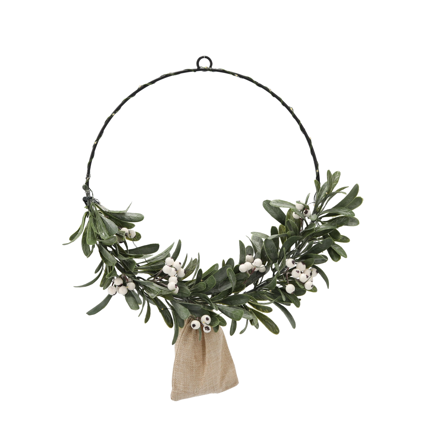 Elegáns, 40 cm átmérőjű karácsonyi koszorú élethű fagyönggyel és finom fehér bogyókkal, amelyet 30 meleg fényű LED ragyog be. A minimalista fémgyűrű és a természetes hatású zöld díszítés stílusos dekorációt alkot ajtóra és falra egyaránt, barátságos ünnepi hangulatot teremtve. A 3× AA elemmel történő működtetésnek köszönhetően könnyen, kábelek nélkül helyezhető el.