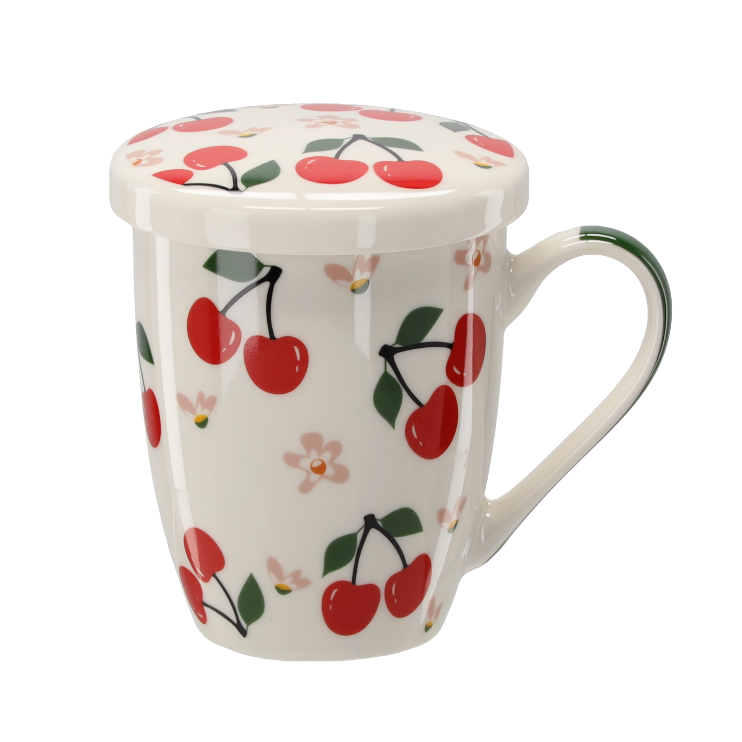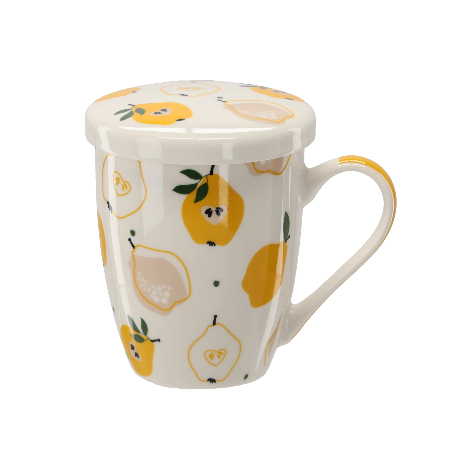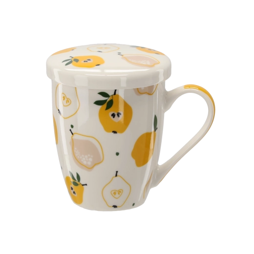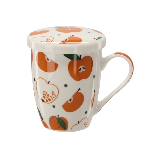 Stílusos, 340 ml űrtartalmú porcelán bögre beépített szűrővel és fedővel, ideális a mindennapi tea- és gyógynövényfogyasztáshoz. A finom szűrőnek köszönhetően szálas tea készíthető zacc nélkül, míg a fedő tovább melegen tartja az italt. A minőségi porcelán, az ergonomikus fül és a friss gyümölcsminták praktikus és szép kiegészítővé teszik a konyhában.