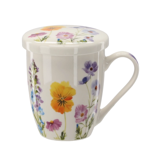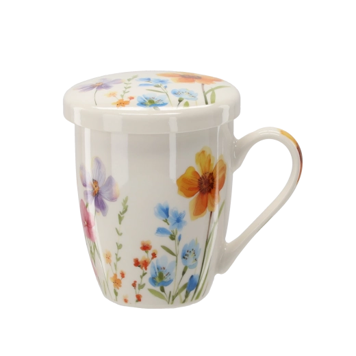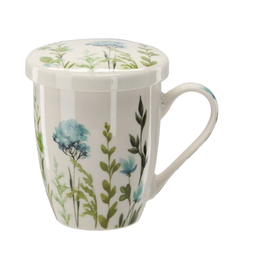 Stílusos porcelán bögre 340 ml űrtartalommal és praktikus rozsdamentes szűrővel, ideális szálas teák és gyógynövényes főzetek készítéséhez. Beépített szűrő a kényelmes áztatáshoz további eszközök nélkül, míg a porcelán tető tovább melegen és védetten tartja az italt. A virágmintás design eleganciát kölcsönöz minden asztalnak, az ergonomikus fül pedig kényelmes fogást biztosít a mindennapi használat során.