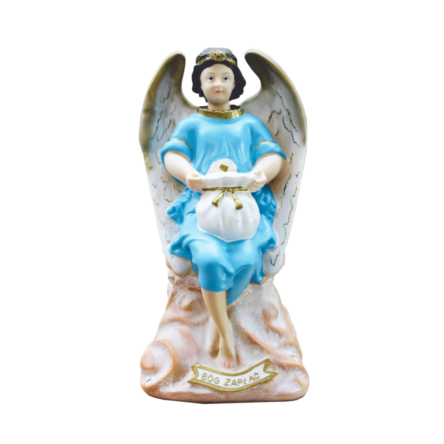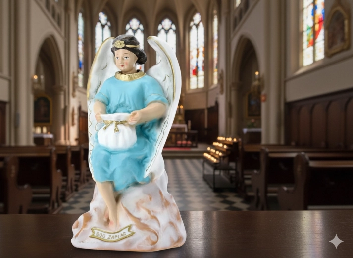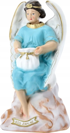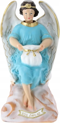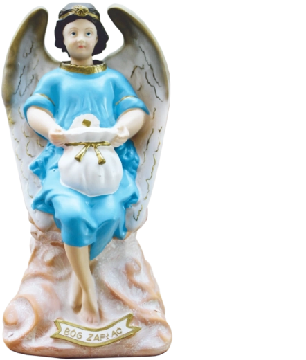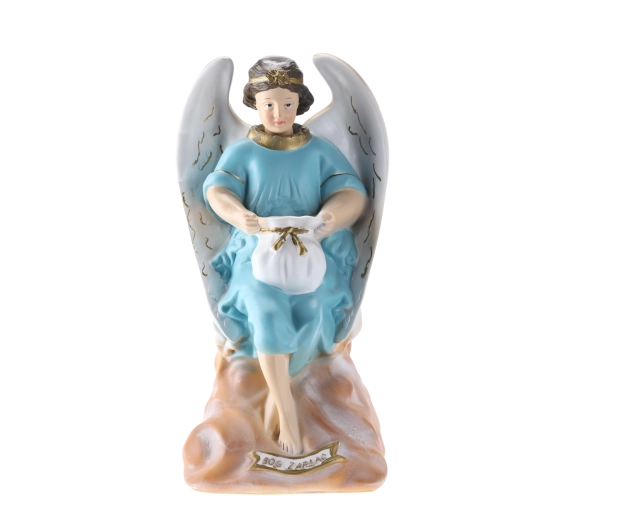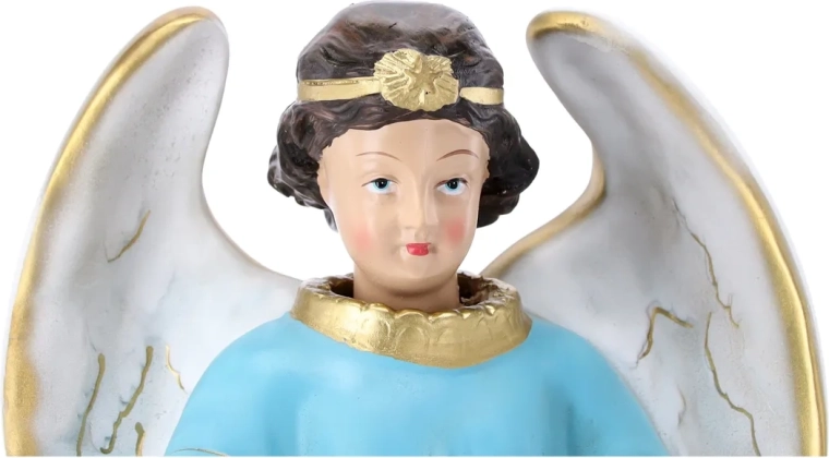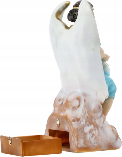 Elegáns angyalszobor finom fehér szárnyakkal és világoskék ruhával, amely ötvözi a dekoratív szépséget és a persely praktikus funkcióját. Gondosan festett részletek, arany akcentusok és tartós polirezine anyag teszik ideálissá lakásdekorációnak, kápolnába, ünnepi asztalra vagy jelentésteli ajándéknak.