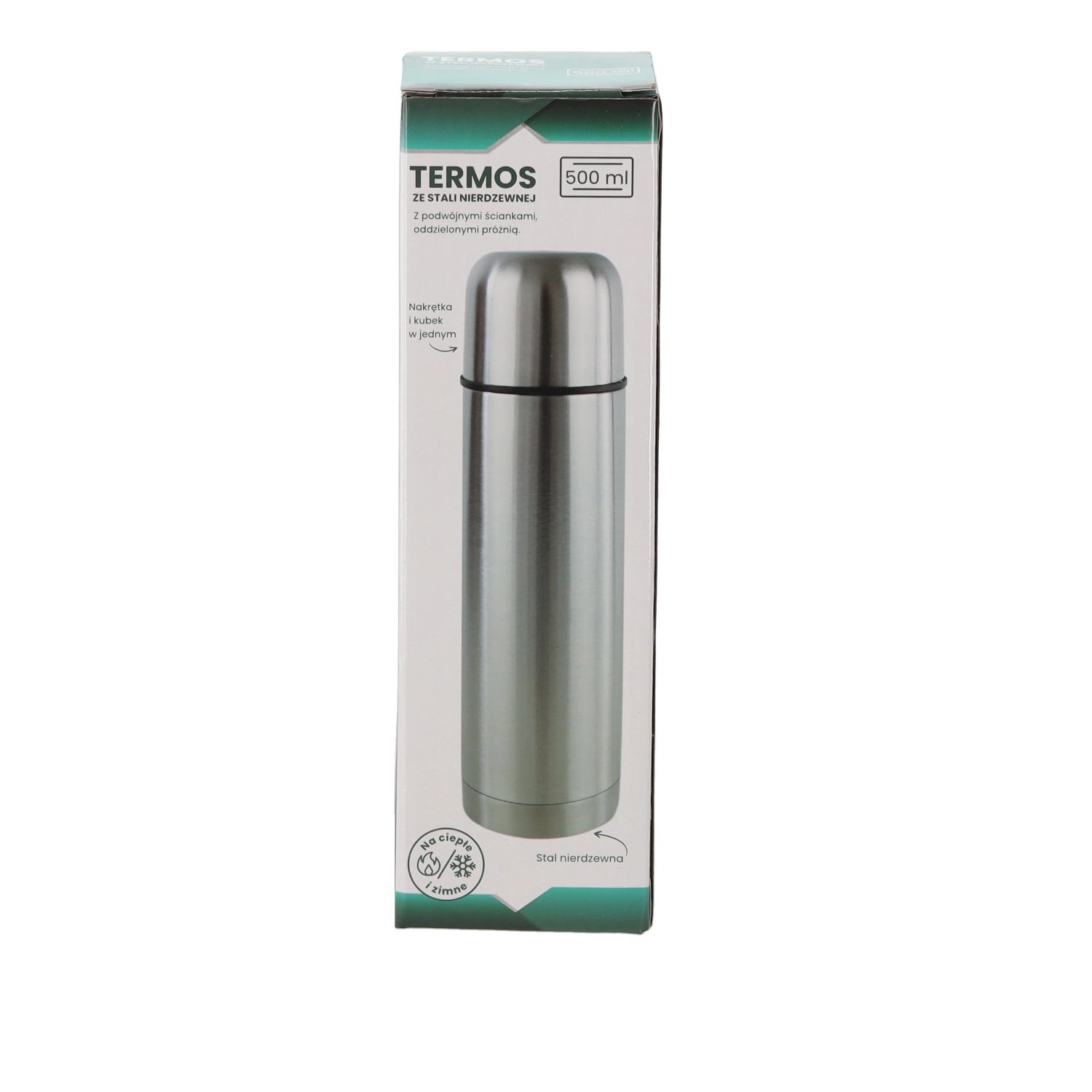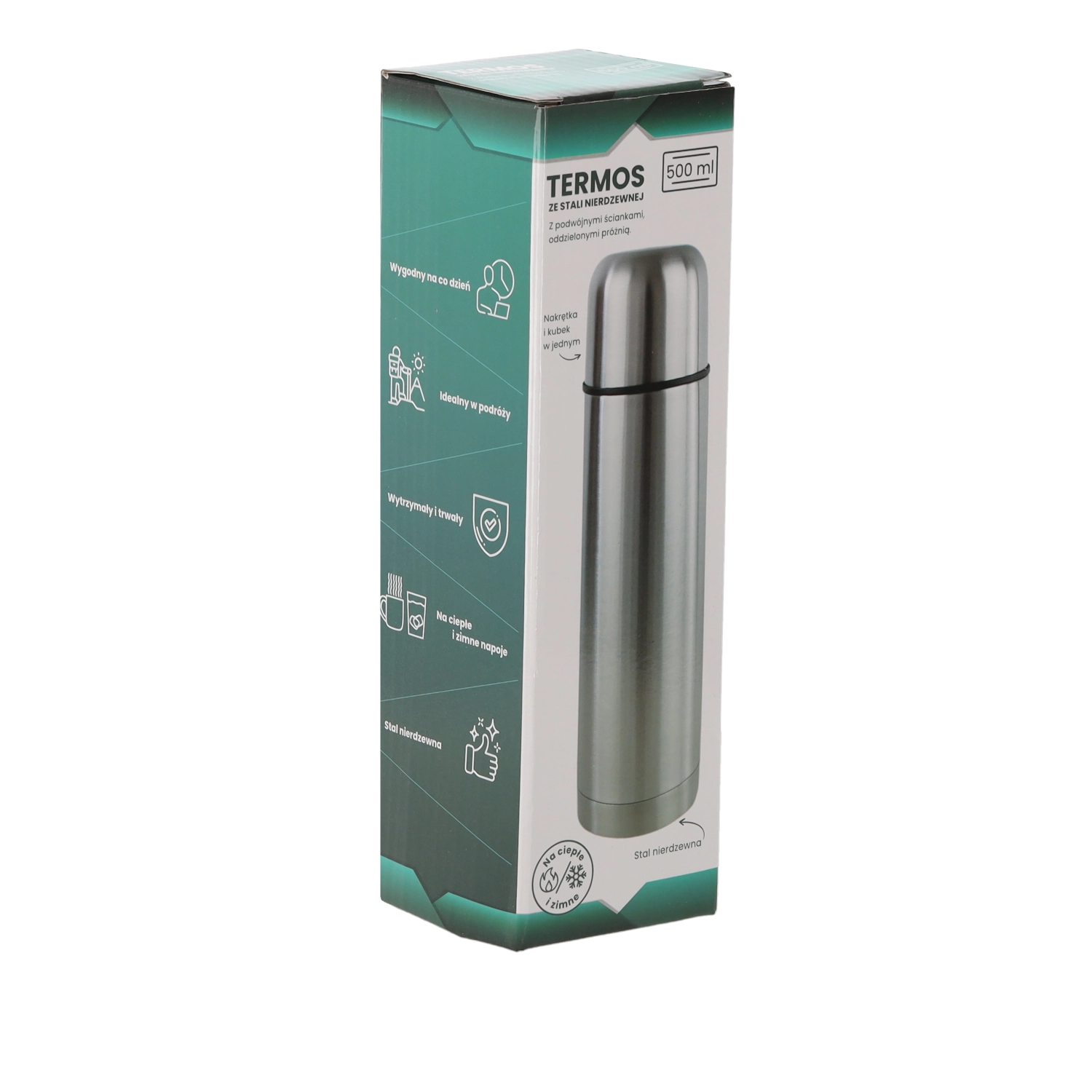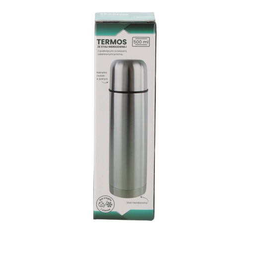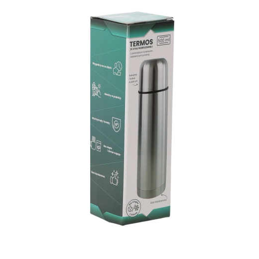 Praktikus és tartós, 500 ml űrtartalmú, dupla falú rozsdamentes acél termosz, amely hosszú ideig melegen vagy hidegen tartja az italokat. A kiváló szigetelésnek köszönhetően akár 24 órás hőmérséklet-stabilitást biztosít, kompakt méretekkel és alacsony tömeggel a mindennapi használathoz úton, munkában vagy sport közben.