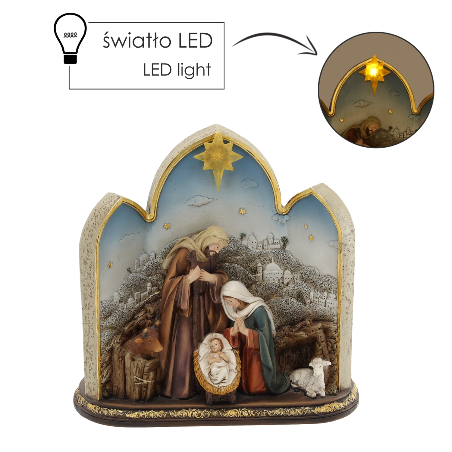 Ez a dekoratív betlehem figura a Szent Családdal, íves keretben finom arany akcentusokkal, hagyományos karácsonyi motívumot hoz modern kivitelben. A meleg LED háttérvilágítású csillag kellemes hangulatot teremt, és ünnepi jelleget kölcsönöz a dekorációnak.