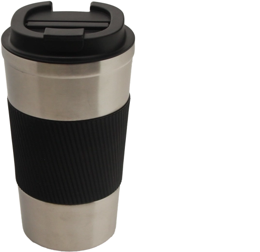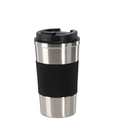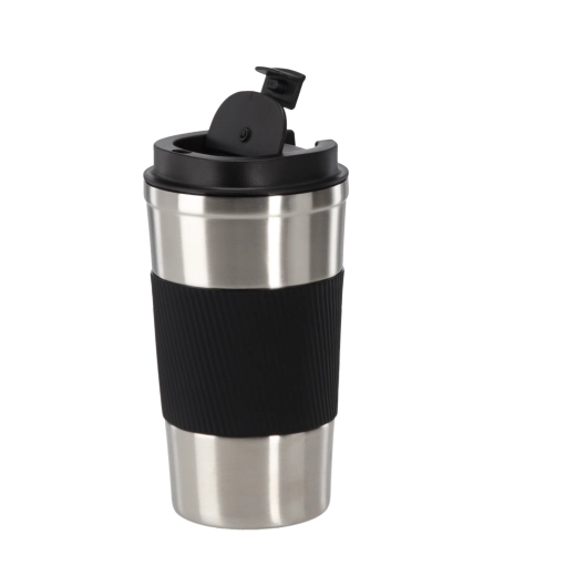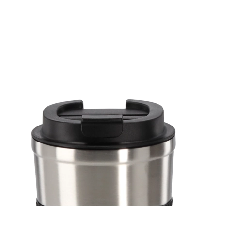 Stílusos utazóbögre egyedi, acélos megjelenéssel, forró kávéhoz és hideg italokhoz egyaránt ideális. A duplafalú vákuumszerkezet hosszabban megtartja a kívánt hőmérsékletet, míg a texturált szilikonpánt biztonságos, csúszásmentes fogást ad.