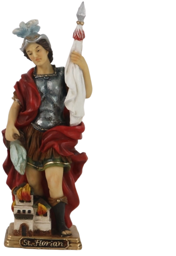 Elegáns Szent Flórián figura – a tűzoltók patrónusa és a tűzvészek elleni védelmező – a hit és oltalom szimbólumát hozza otthonába. 22,5 cm magas, gondosan kidolgozott és kézzel festett, ideális házi oltárra, kis kápolnába vagy különleges ajándéknak is.