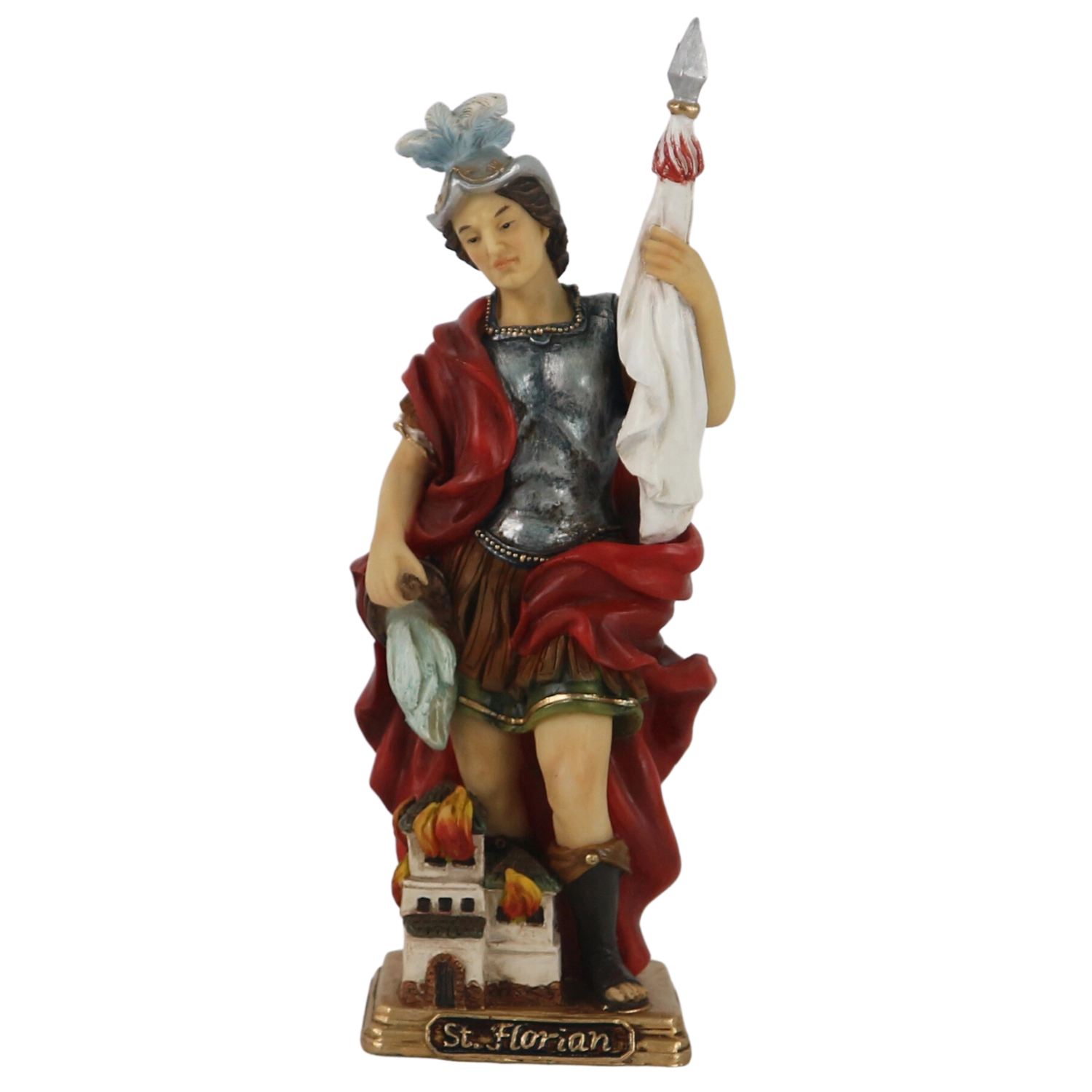 A páncélt, köpenyt és zászlót viselő Szent Flórián szobra a kézi festésnek és a gondosan megformált részleteknek köszönhetően kifejező és mély hatást kelt.