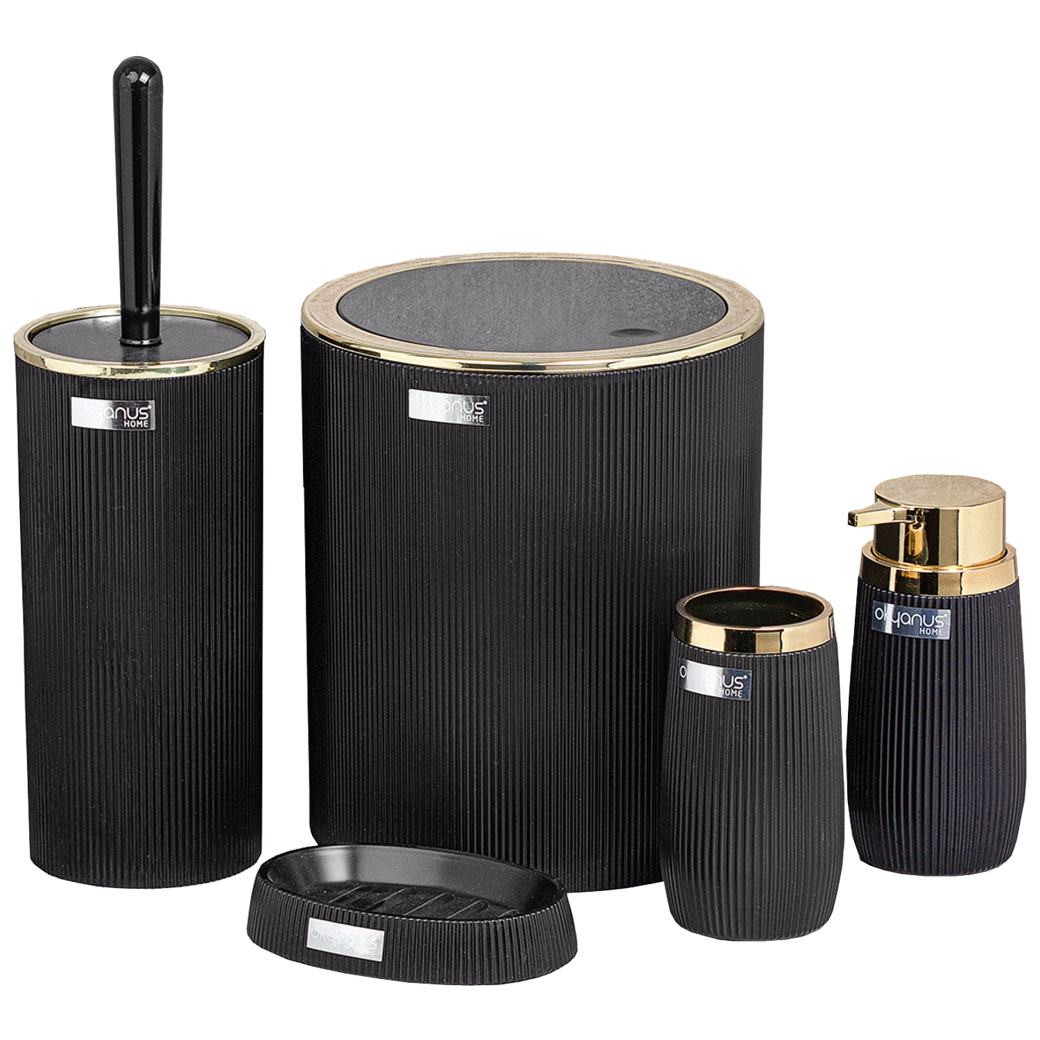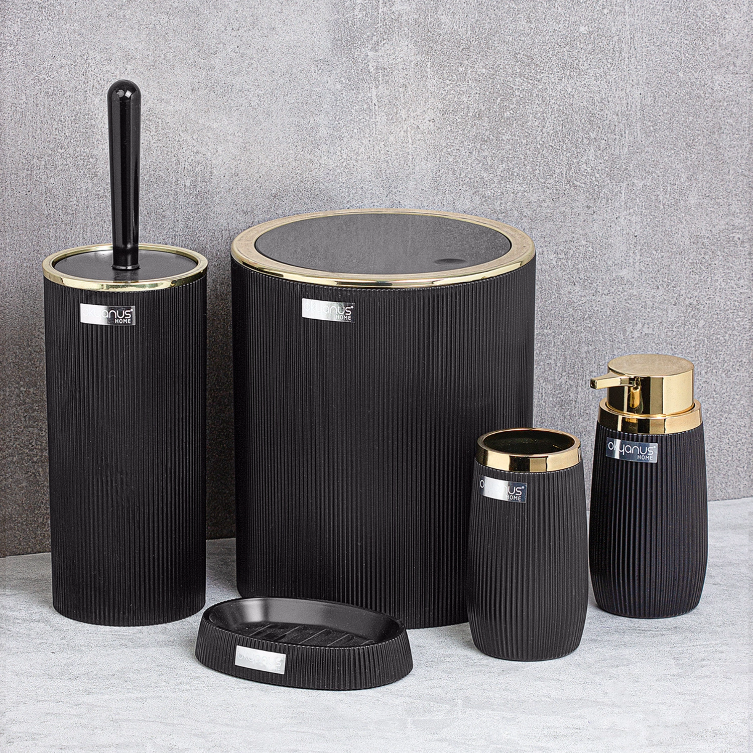 Elegáns, kerek fürdőszobai szett tartós műanyagból, fekete és arany kombinációban, amely luxus megjelenést és praktikusságot kölcsönöz fürdőszobájának. A csomag 5 alapvető kiegészítőt tartalmaz a mindennapi higiéniához: szemetes, WC-kefe, szappanadagoló, fogkefetartó pohár és szappantartó. Könnyű karbantartás, könnyű anyagok és stílusos részletek a tökéletesen összehangolt megjelenésért.