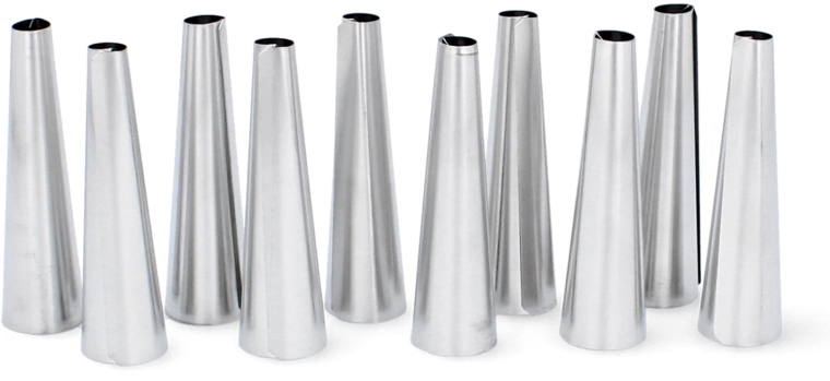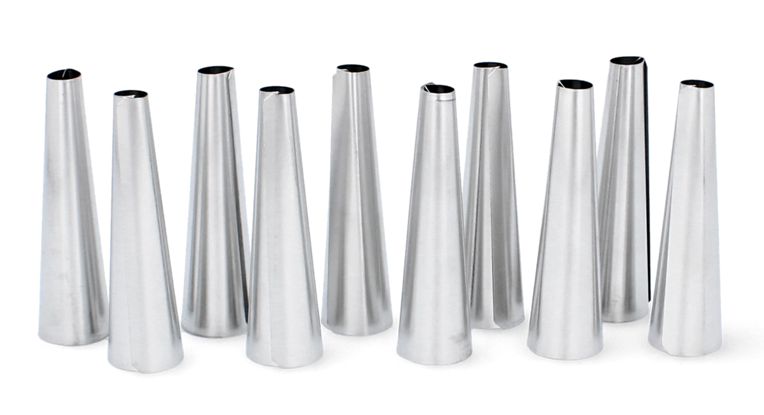 Praktikus, 10 darabos, tartós acélból készült kremroliforma-készlet, amellyel tökéletesen formázott rúdcskákat készíthet édes és sós töltelékekhez. Kúpos kialakításának és kompakt méreteinek köszönhetően a tészta könnyen formázható, sütés után pedig egyszerűen lehúzható. A formák kiváló minőségű anyagból készülnek, akár 230 °C-ig bírják a hőt, strapabírók, könnyen tisztíthatók és többször használhatók.