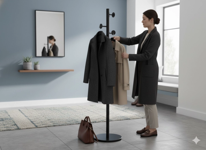 Váltakozó elrendezésű, különböző magasságban elhelyezett akasztók, hogy kabátokat, kalapokat, sálakat és táskákat gyűrődés nélkül lehessen felakasztani.